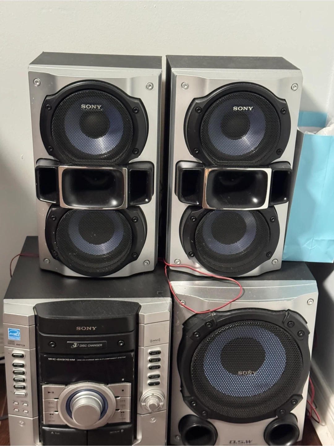 Selling a Sony stereo system, model MHC-GX570XM. It features a 3-disc changer and D.S.W speakers. Perfect for anyone looking for a classic stereo setup!