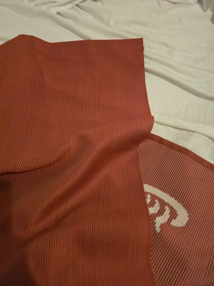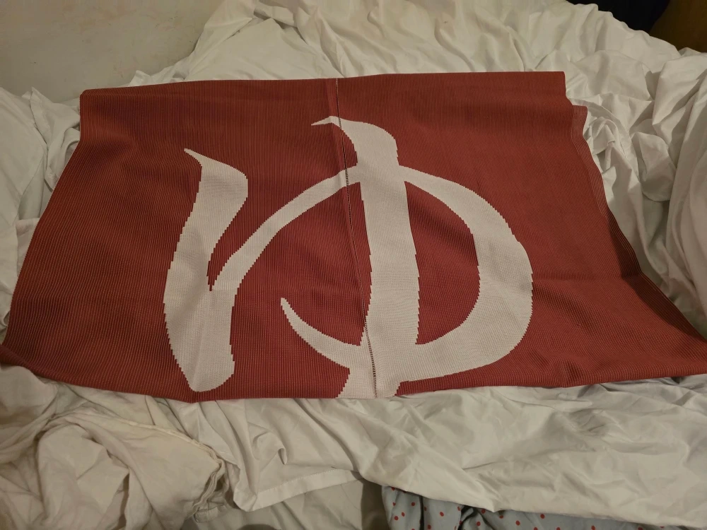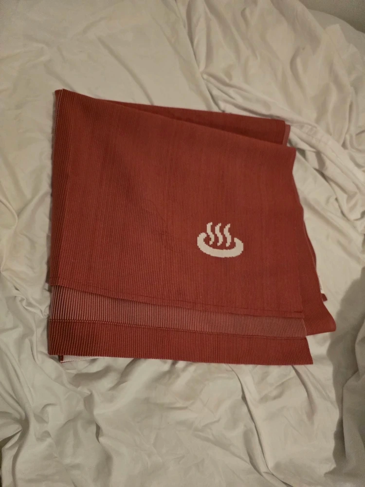 Here's a red, Japanese-style curtain with a white Japanese Character YU logo. It's in new condition and ready for a new owner!