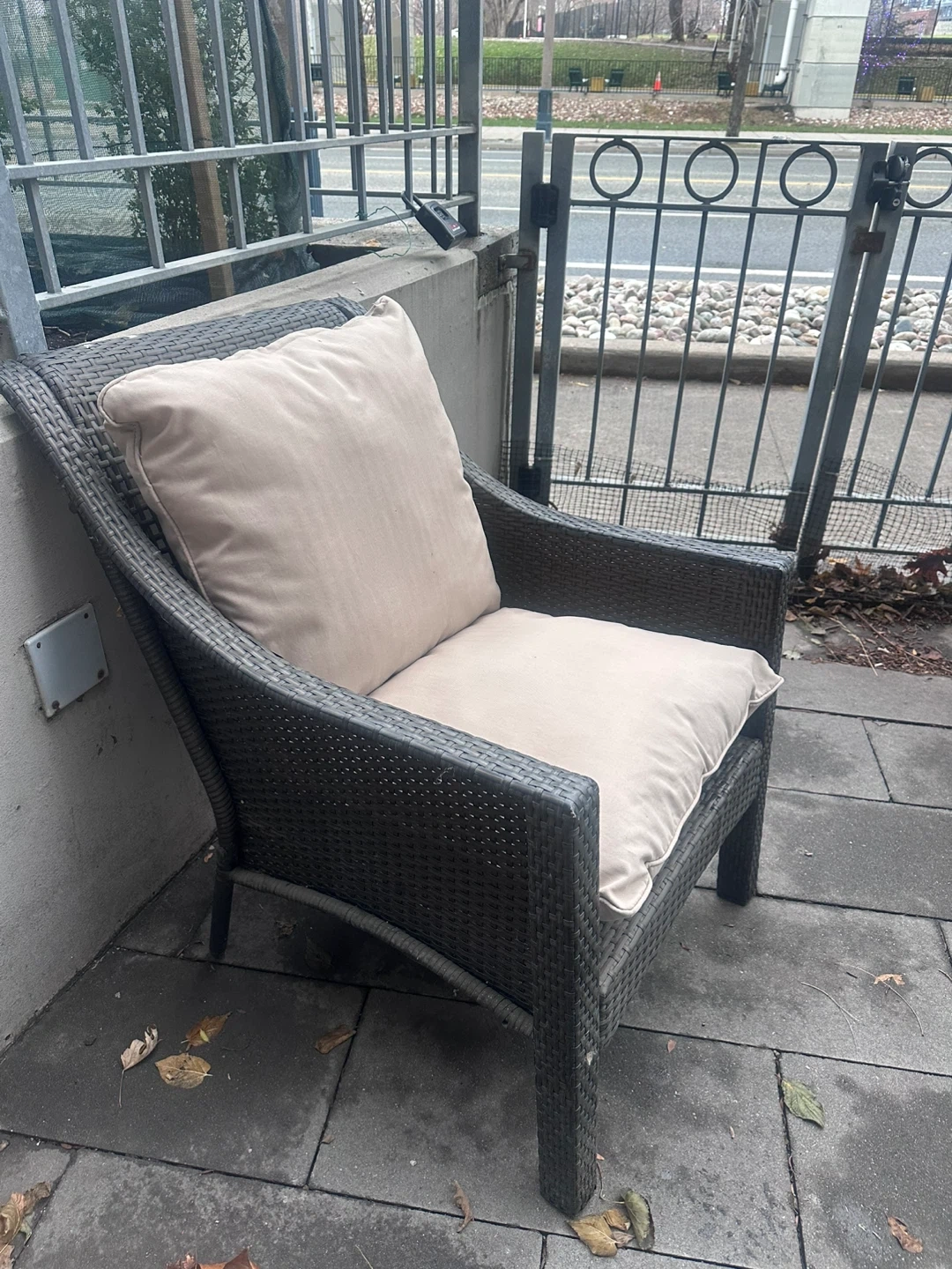 Selling 2 wicker patio armchair with a beige cushion $50 for each chair with cushions. It's perfect for relaxing outdoors on your deck or patio. The chair is in great condition and ready for a new home!