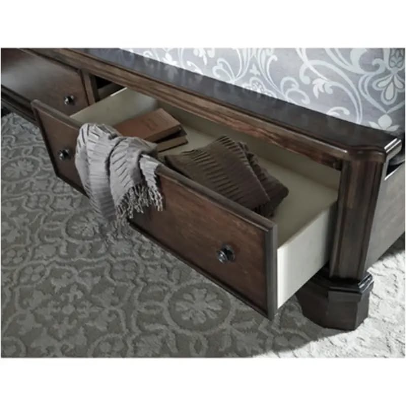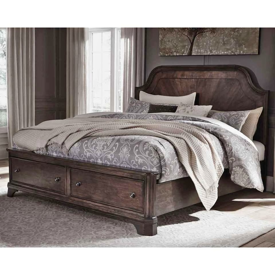 Ashley's Adinton 3 piece QUEEN Bed for SALE. It is Brand New and Comes Product Features: - Includes headboard, storage footboard, rails and roll slate - Footboard with 2 storage drawers - Bed does not require a BOX Spring - Made of wood, veneers and engineered wood COLOUR BROWN DIMENSIONS: