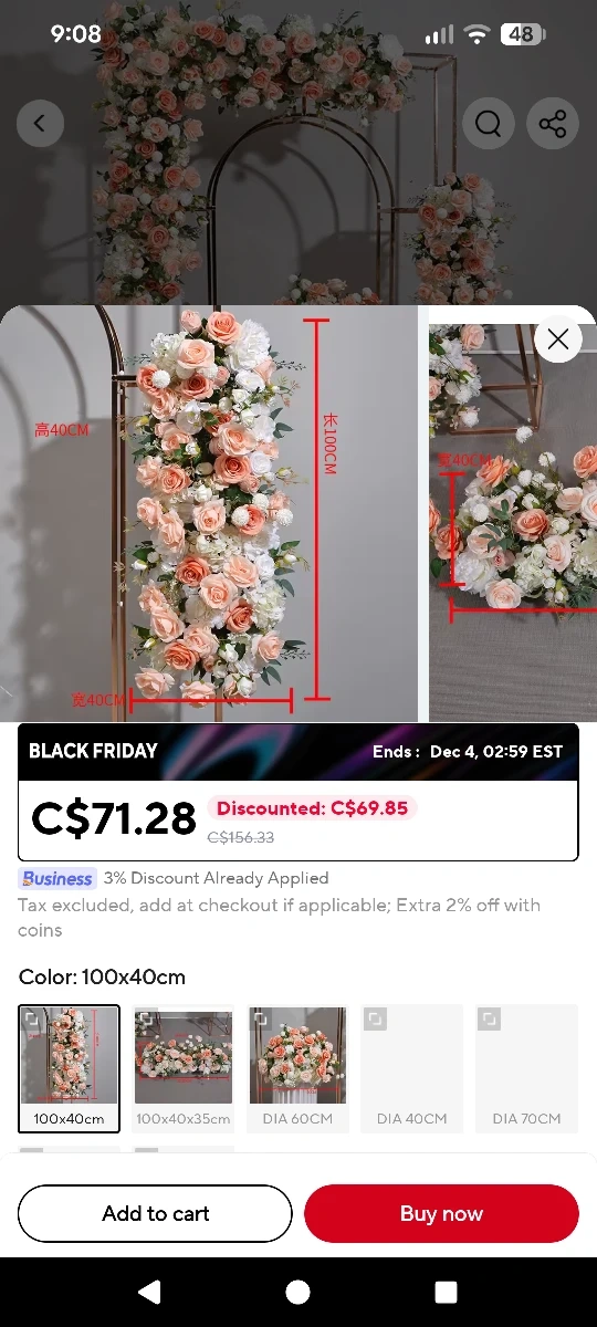 Buy & SellFloral Arrangement 100x40cmFloral Arrangement 100x40cm$50Selling a beautiful floral arrangement! It measures 100cm in length and 40cm in width. The original price was $71.28.WHERE TO MEETCheck LocationView MapSELLERNiki3317 Sixth Line50 reviews0 chats·0 favorites·2 views