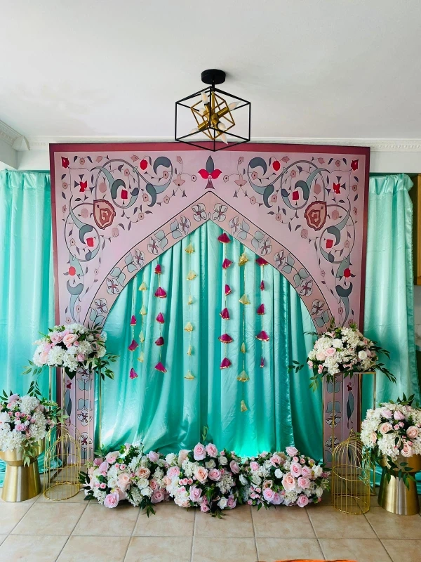 Selling a beautiful backdrop perfect for weddings or special events. It comes with lovely floral arrangements to complete the look. The backdrop features a unique design and is sure to add a touch of elegance to any occasion!