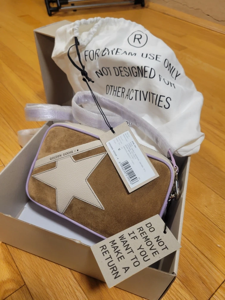 Selling a Golden Goose Star Bag. It's a stylish cross-body bag featuring a brown suede exterior with a white star detail! It comes with its original box and dust bag. The tag says 'Do not remove if you want to make a return'.