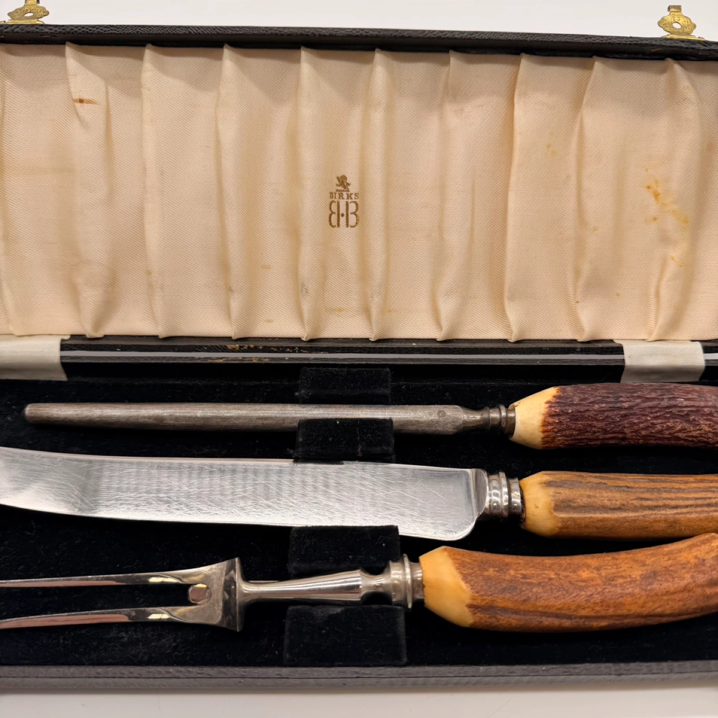 Beautiful vintage Birks EB 3-piece carving set with genuine stag (antler) handles, including: