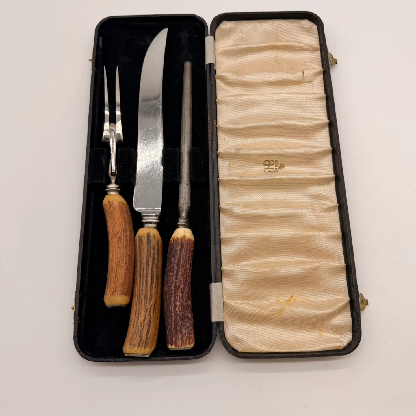 Beautiful vintage Birks EB 3-piece carving set with genuine stag (antler) handles, including: