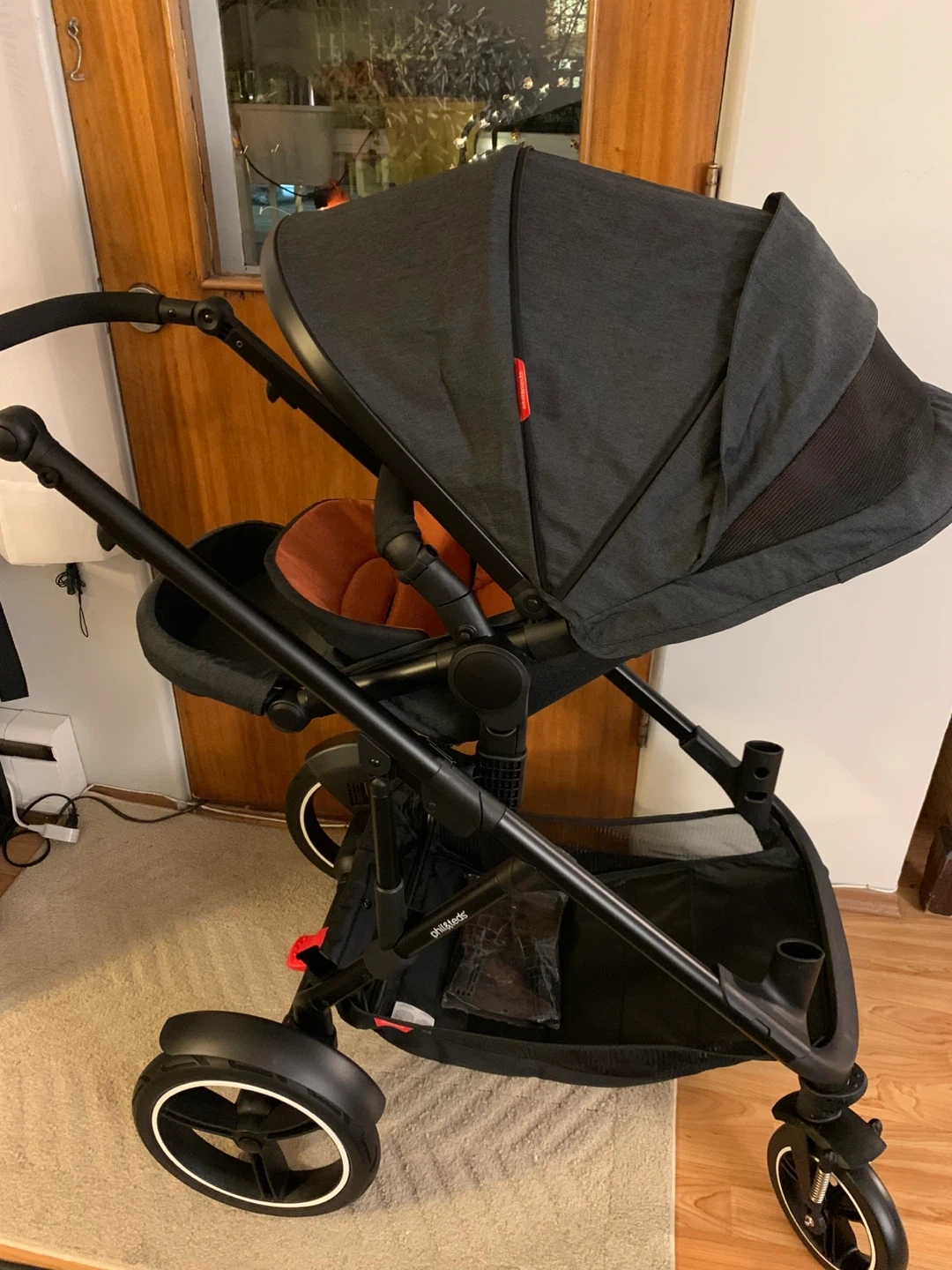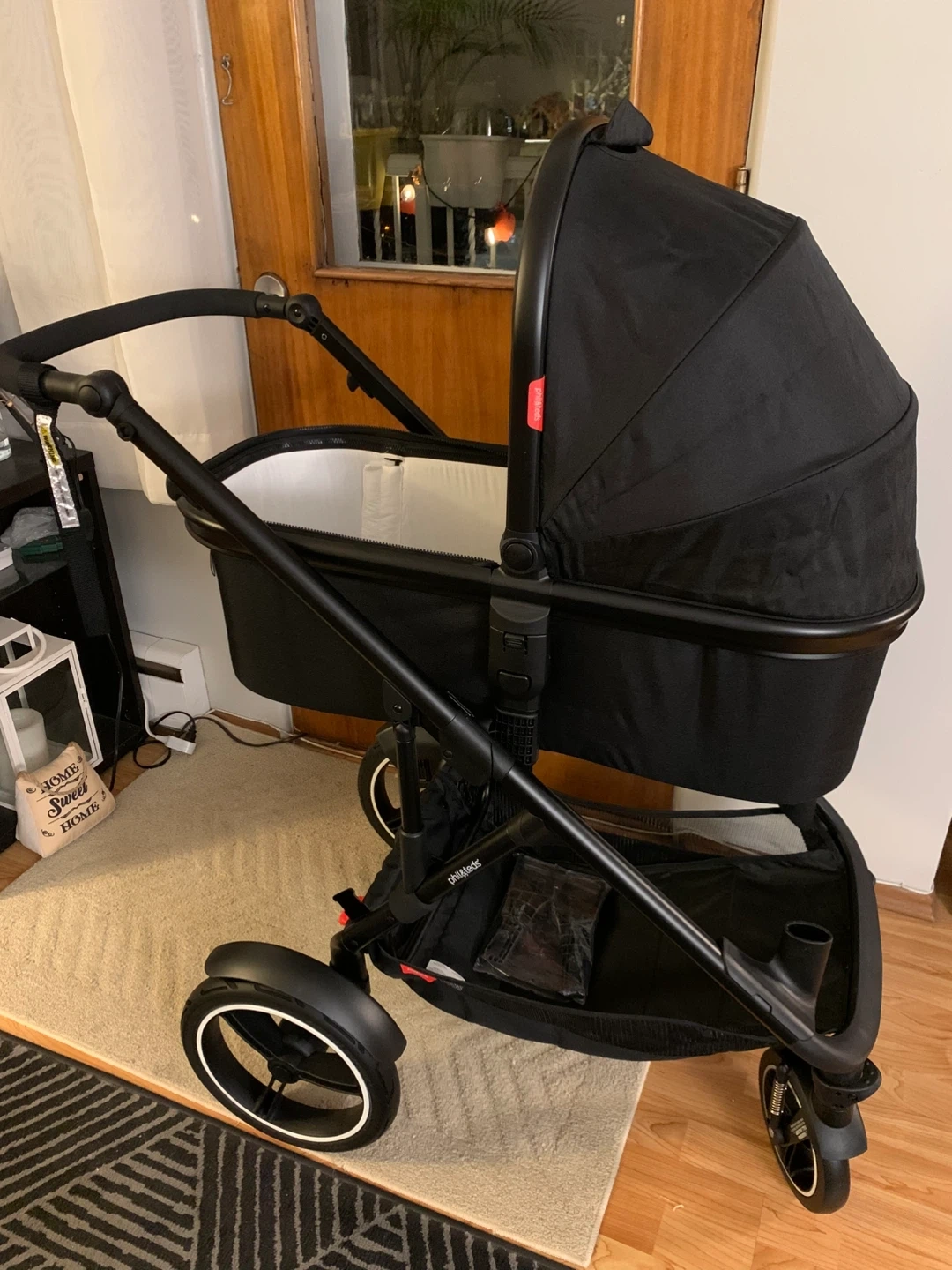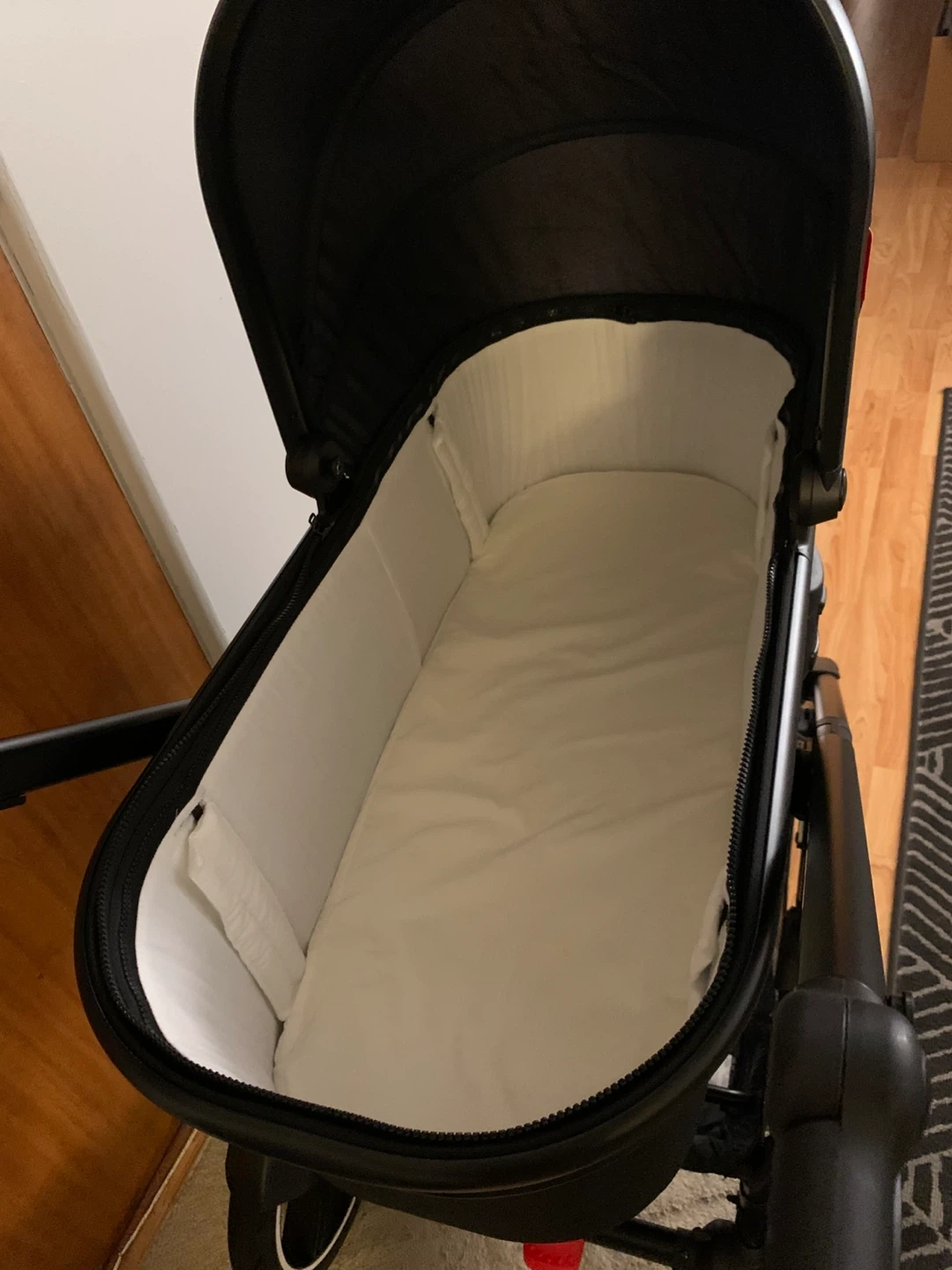 Absolutely new, never used. Comes with bassinet, main seat, seat liner in rust color, maxi-cosi/cybex car seat adaptors.