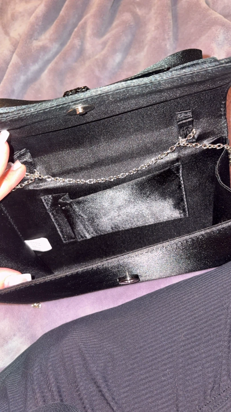 This is a lovely black satin clutch with a chain strap. It features a decorative bow with rhinestone accents. It's in great condition and perfect for an evening out!