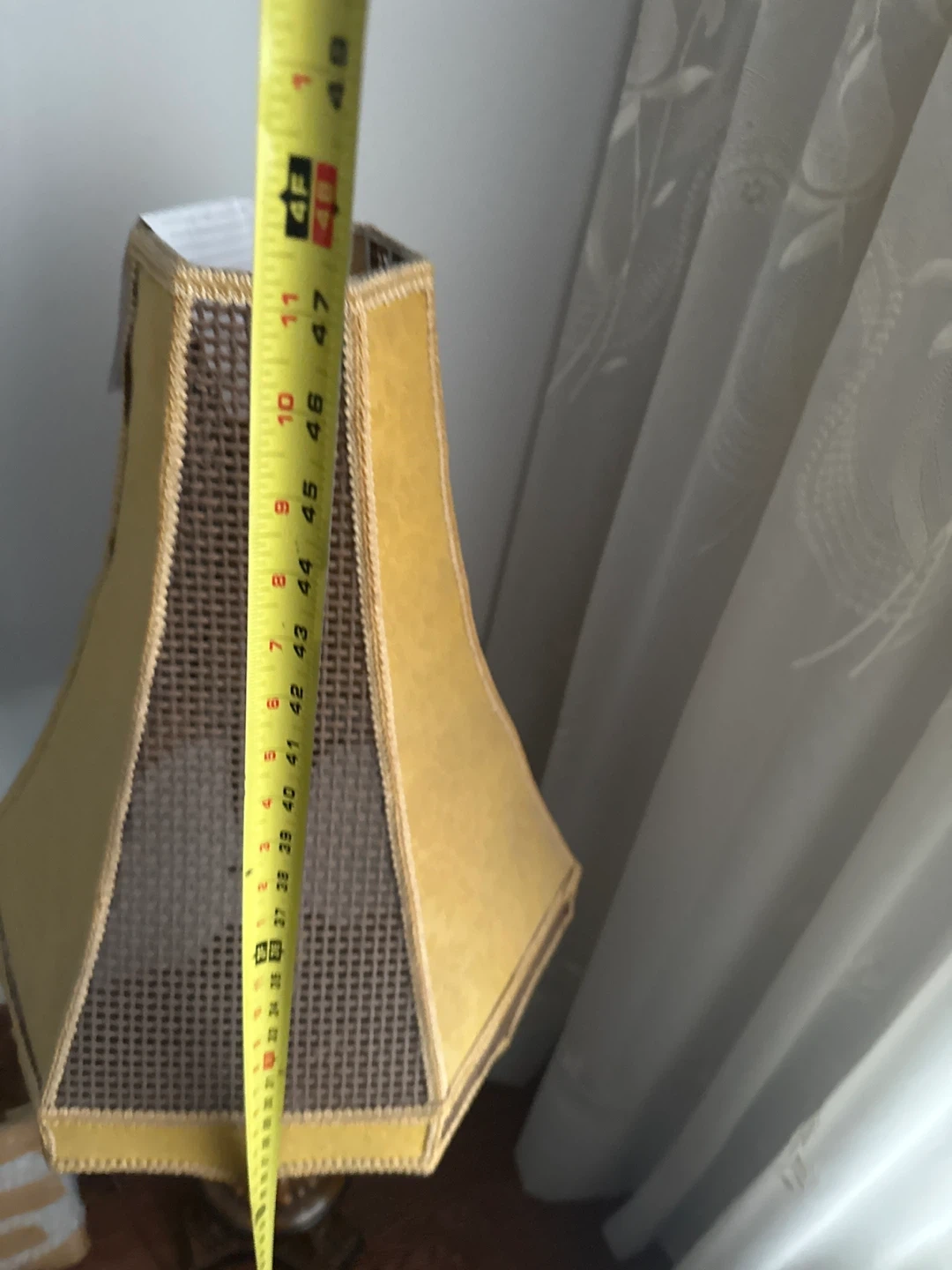 Selling a vintage-style table lamp. It has a unique design with a brown and yellow shade. The lamp stands at approximately 48 inches tall. Perfect for adding a touch of classic elegance to any room!
