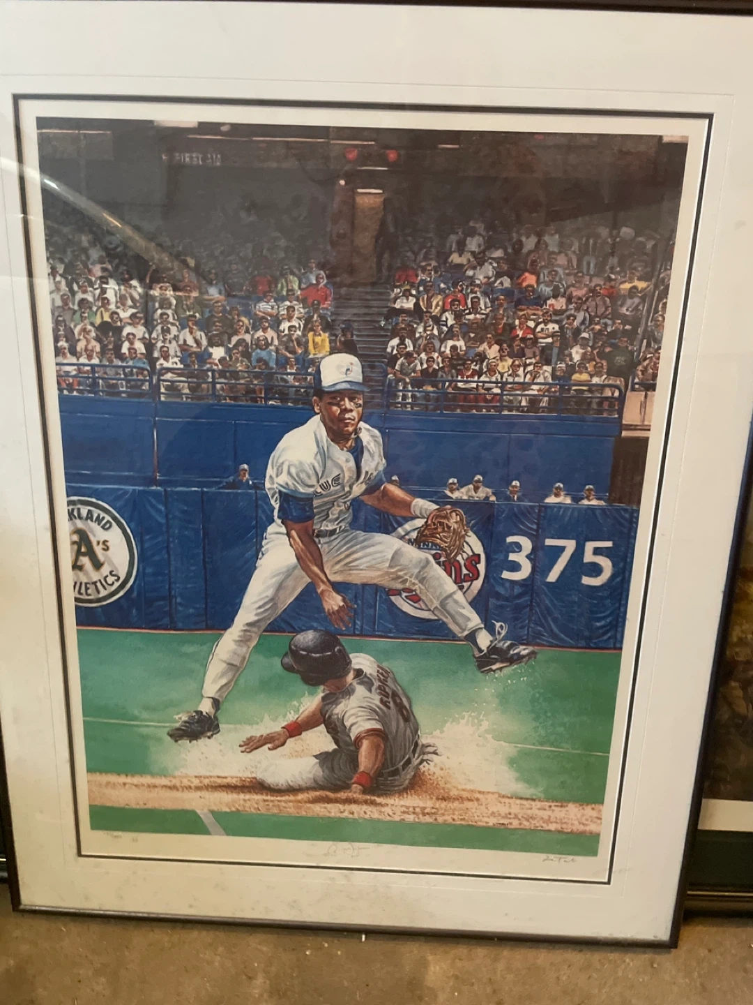 The print depicts a baseball play at second base, with Toronto Blue Jays player Roberto Alomar leaping over a sliding Oakland Athletics player.