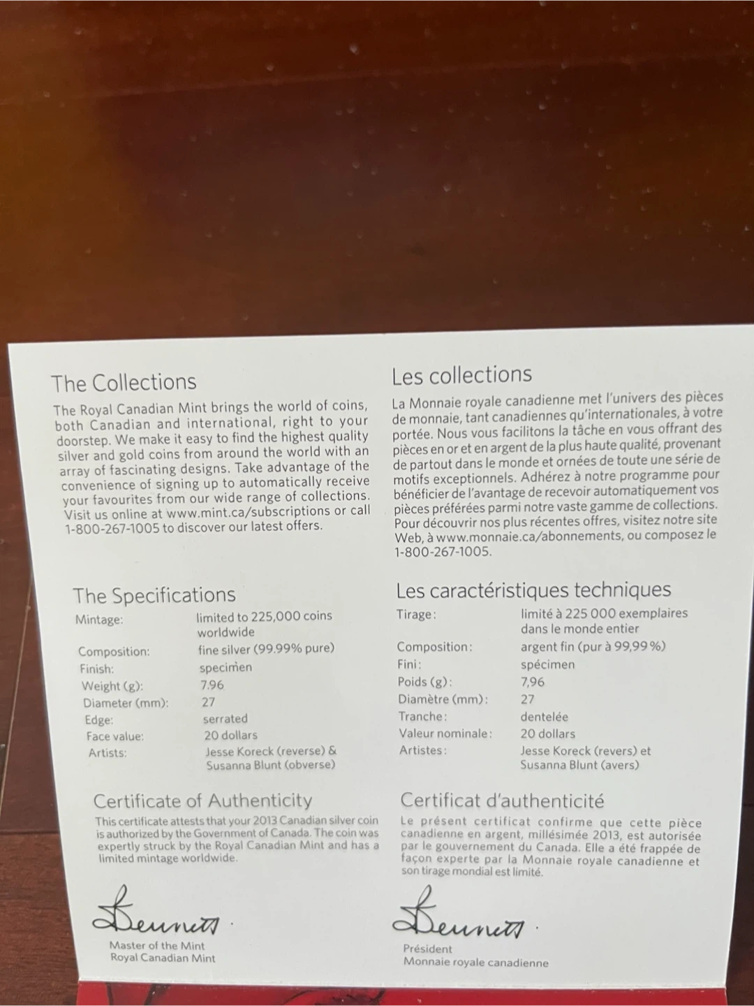 Selling a 2013 fine silver $20 coin from the Royal Canadian Mint. It's a limited mintage coin with a fine silver (99.99% pure) composition. The coin weighs 7.96g and has a serrated edge. The artists are Jesse Koreck (reverse) and Susanna Blunt (obverse).