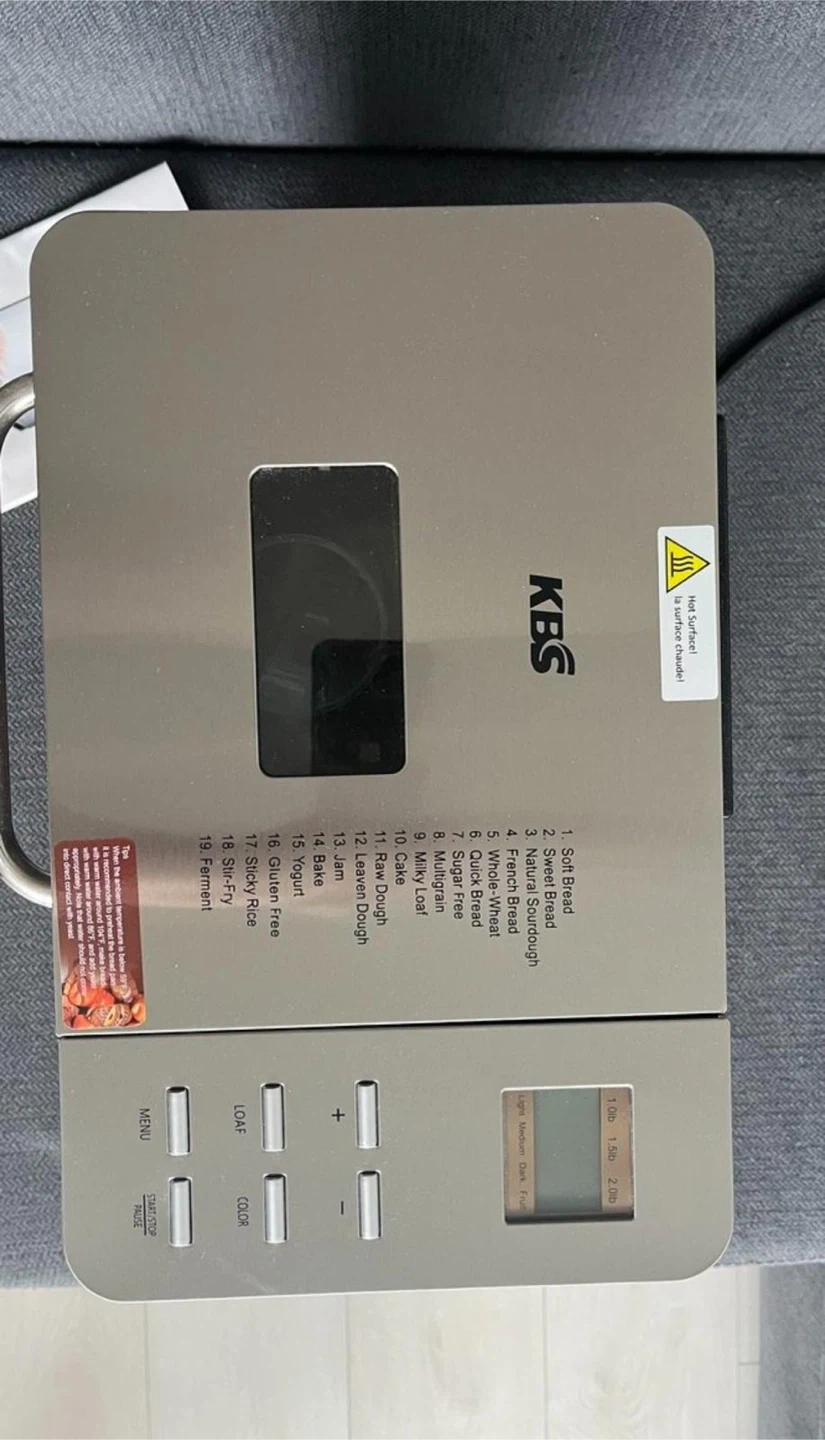 Selling a KBS MBF-013 bread maker! Used only once - I have stopped eating breads. It comes with the user manual. Perfect for baking a variety of breads, cakes, and even yogurt right at home.