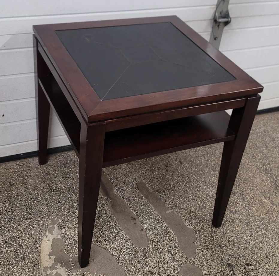 Here's a lovely dark brown end table! It has a square top with a unique design and a convenient shelf underneath. It's in great condition and would look perfect next to a sofa or bed