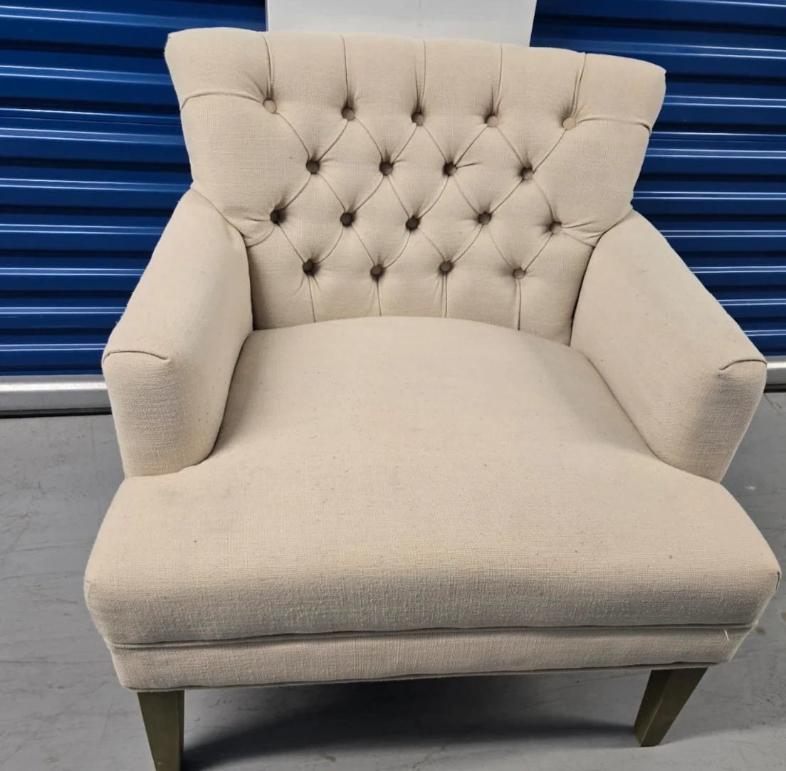 Selling a comfy armchair! It's a lovely beige colour with tufted detailing on the back. Perfect for adding a touch of elegance to any room!