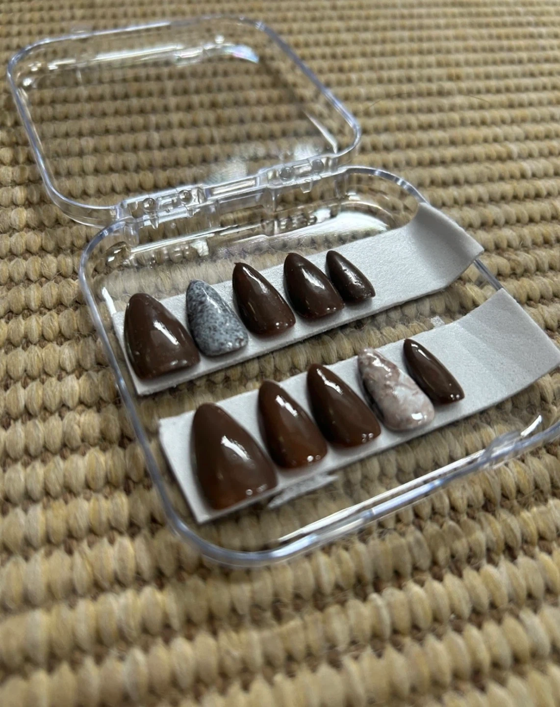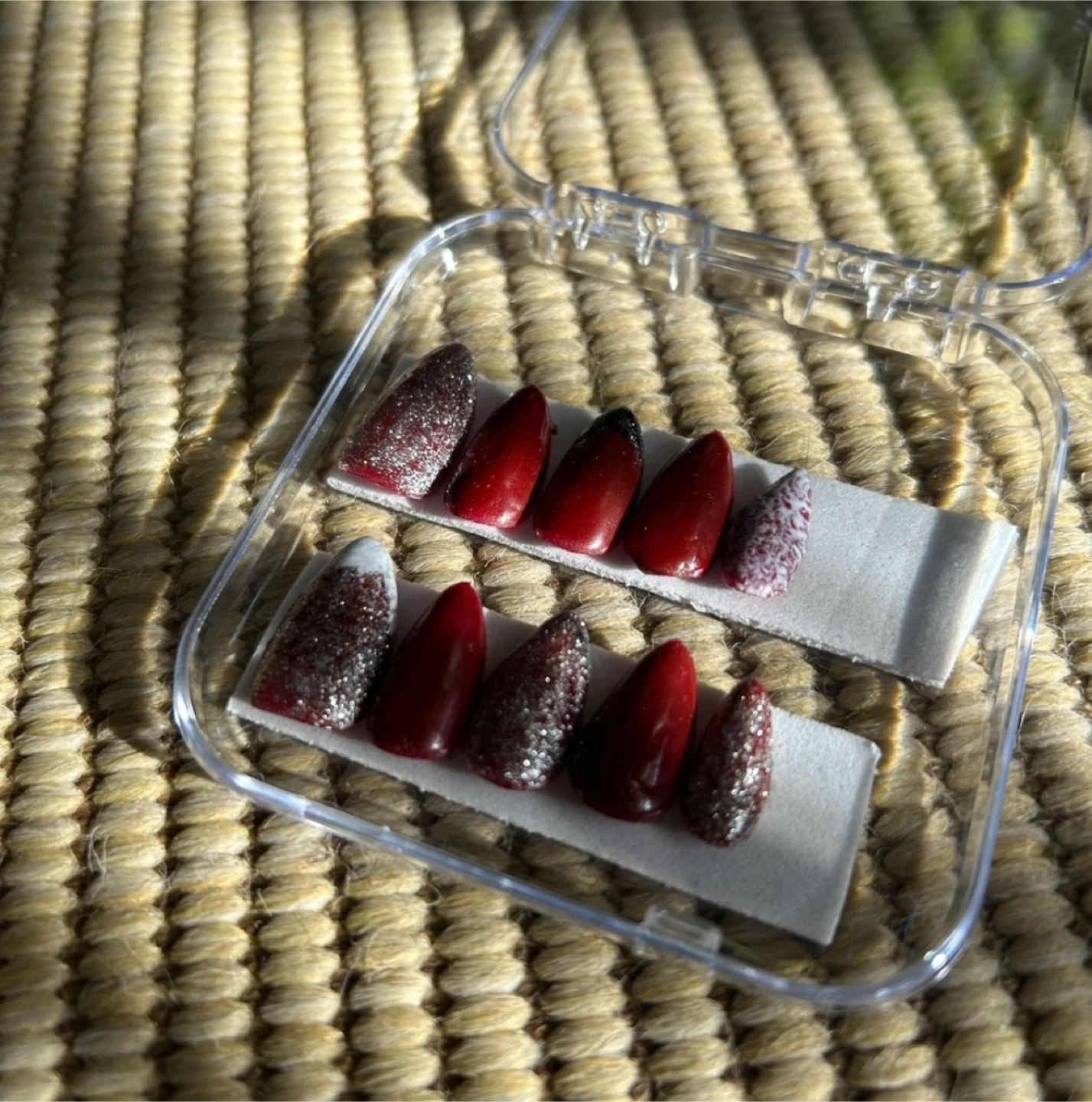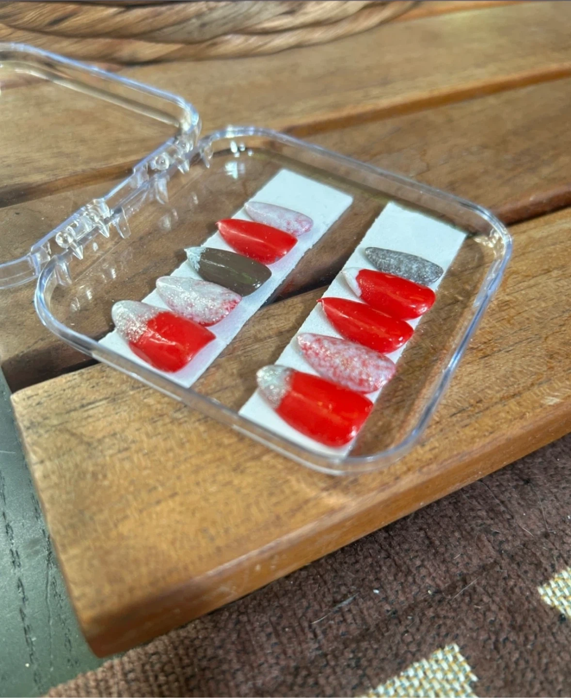 A variety of press on nails in different colours and designs! Perfect for a quick and easy manicure at home. They come in a clear plastic case for easy storage and organization