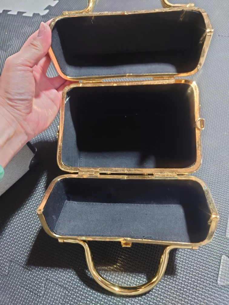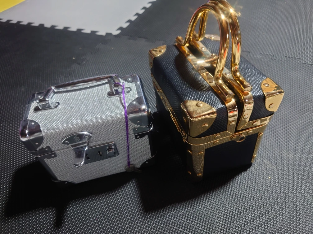 Here are two mini suitcase style cosmetic cases! One is a silver colour and the other is black with gold accents. They’re perfect for storing your makeup or other small items.