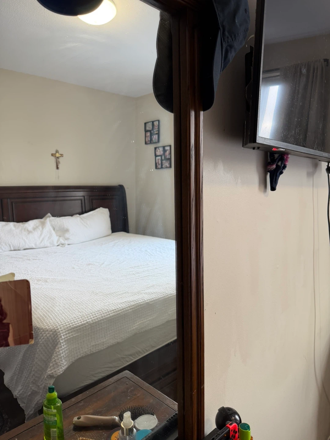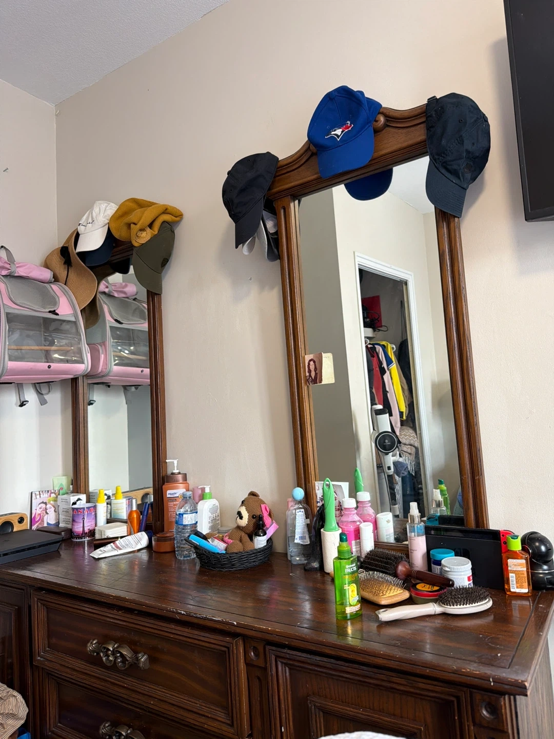 Selling a vintage wooden dresser with a matching mirror. It has a classic design with ornate drawer pulls. There are some signs of wear and tear, but it's still a beautiful and functional piece of furniture. Perfect for adding a touch of vintage charm to any room!