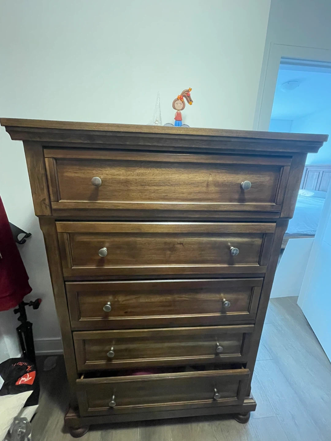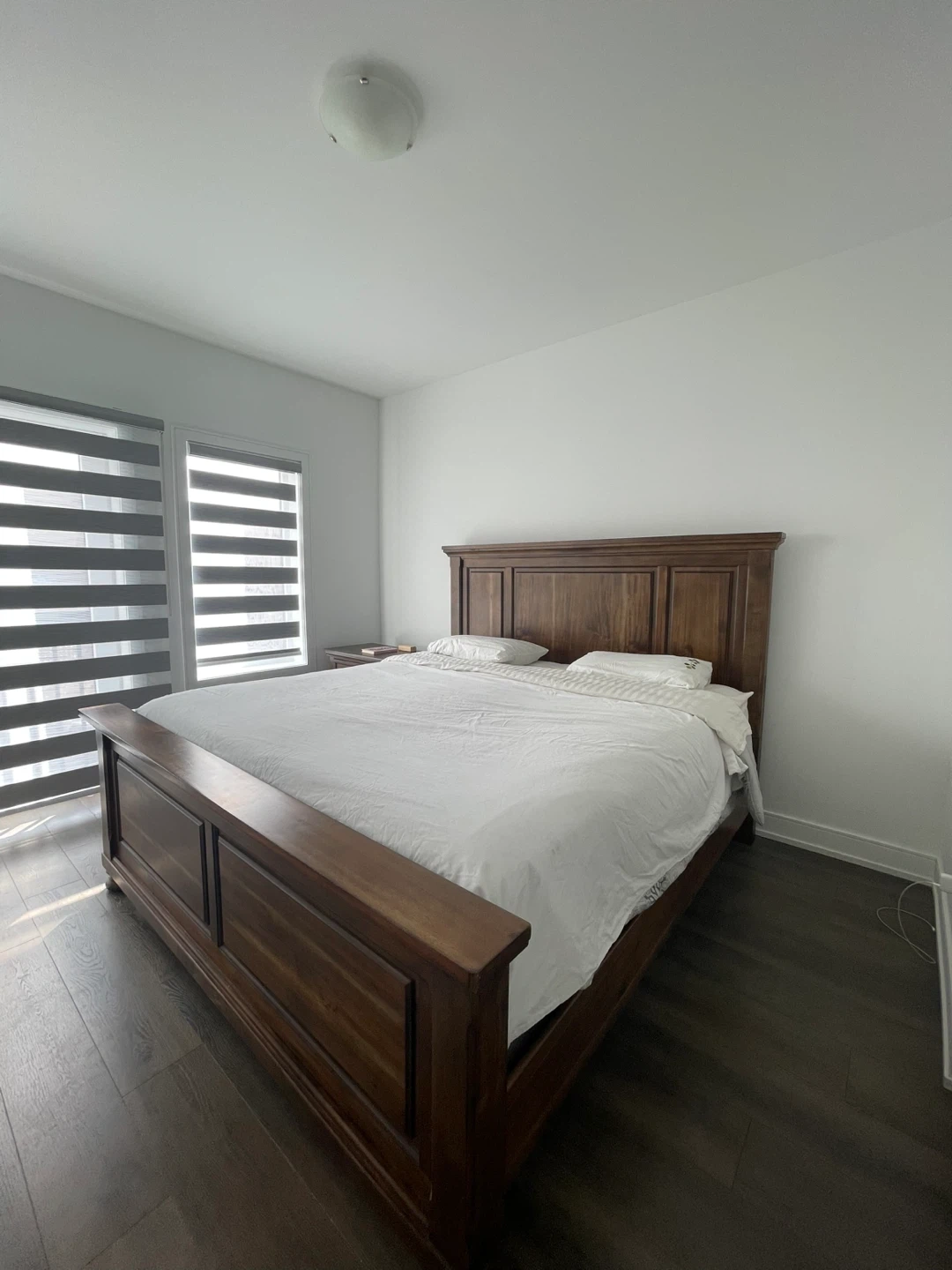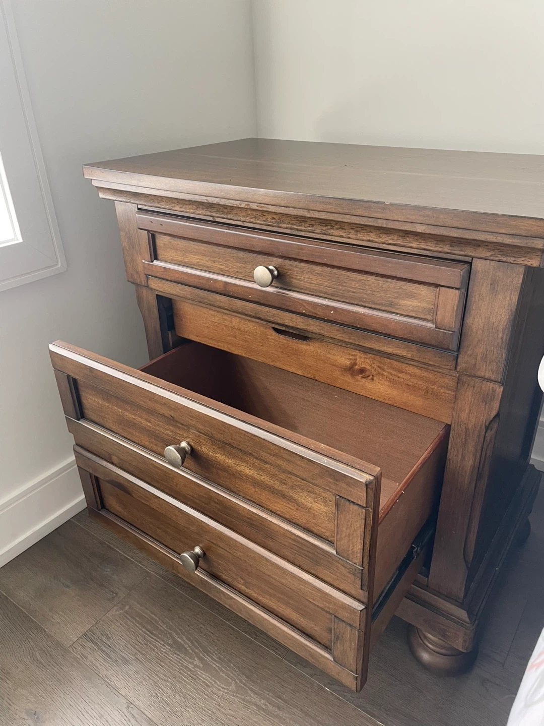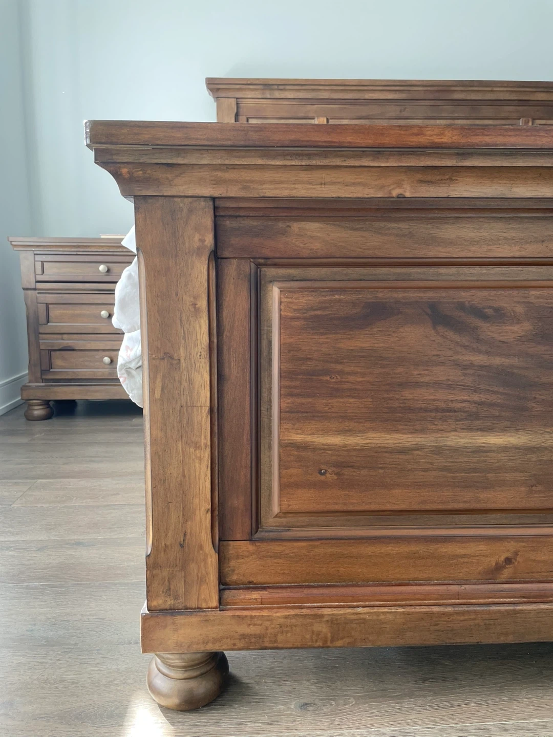 Selling a beautiful wooden queen size bed frame, complete with a matching nightstand! The set has a rich, warm tone and classic design, perfect for adding a touch of elegance to any bedroom. It's in great condition and ready for a new home.