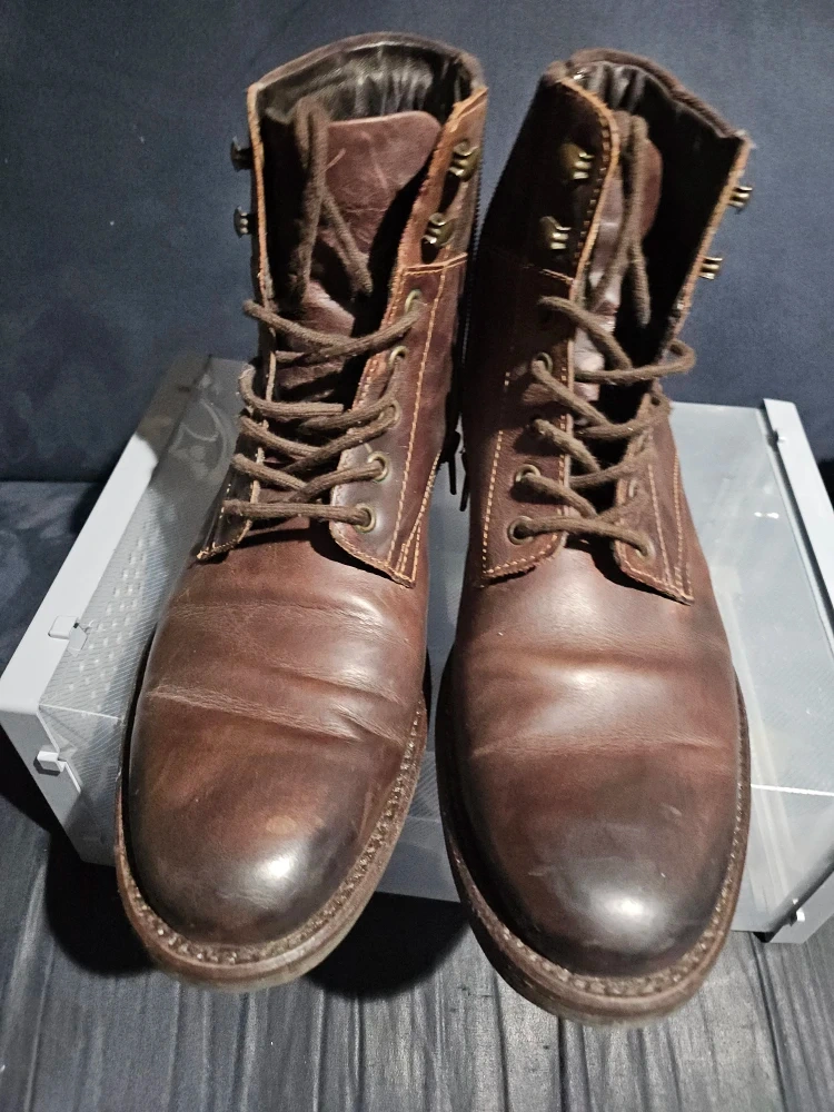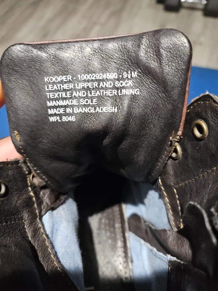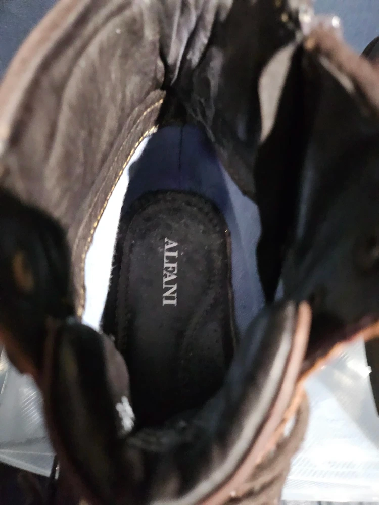 Selling a pair of Alfani Kooper boots in size 9.5M. They are a stylish brown color and made with a leather upper and sock. The lining is a mix of textile and leather, and the sole is manmade. These boots have a cool, worn look!