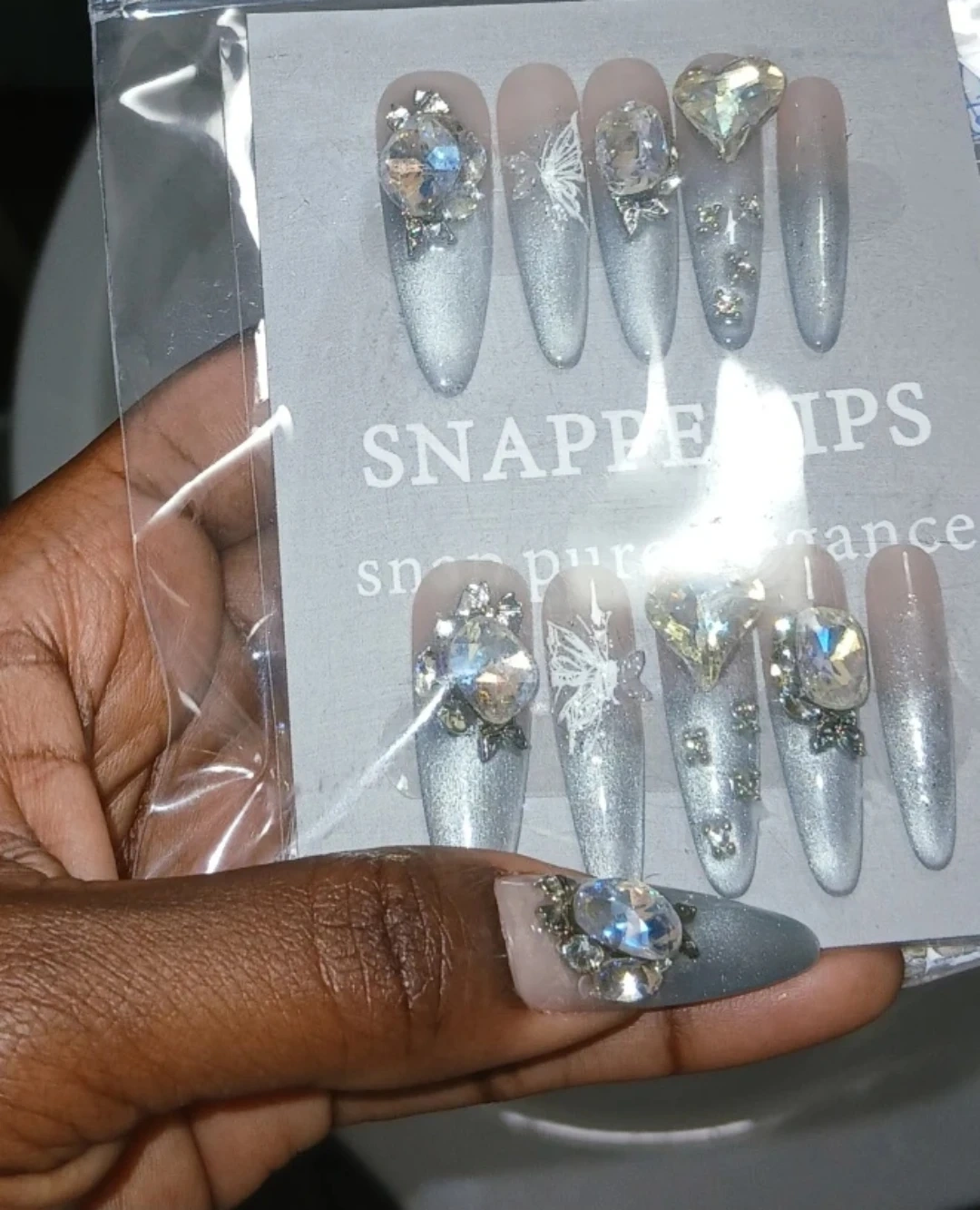 Selling these beautiful press-on nails with rhinestone accents! They come with everything you need for application, including an alcohol pad and a cuticle stick. There are also instructions on how to apply and remove them!