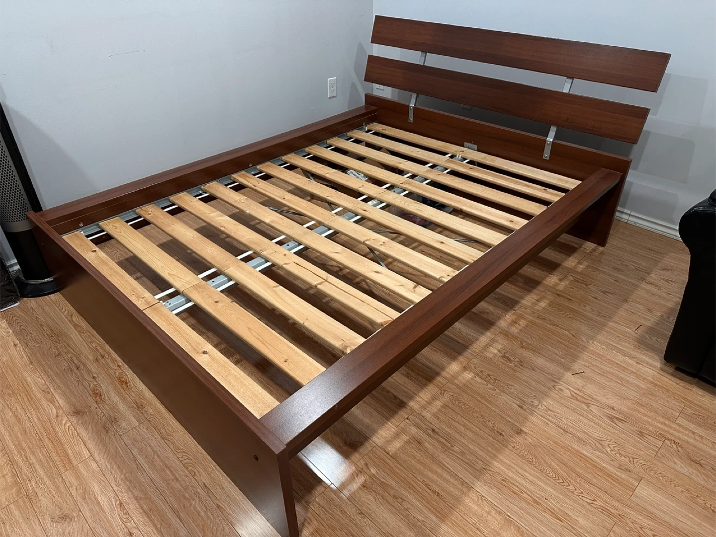Here's a double size bed frame in a dark wood finish! It's in good condition and comes disassembled for easier transport. All the pieces are included to put it back together. Perfect for a bedroom upgrade!