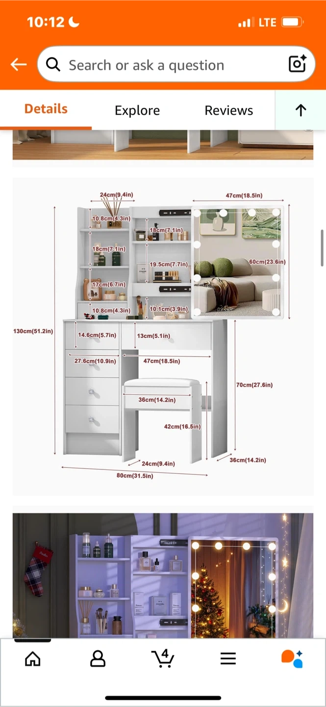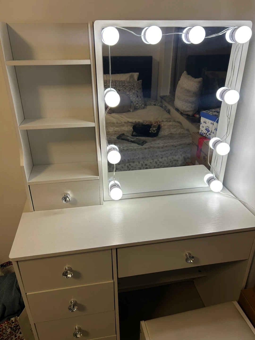 Selling a vanity table with a lighted mirror and stool. It's perfect for getting ready! The vanity has drawers and shelves for storage, and the lighted mirror is great for applying makeup. The set includes a matching stool. It's in great condition!