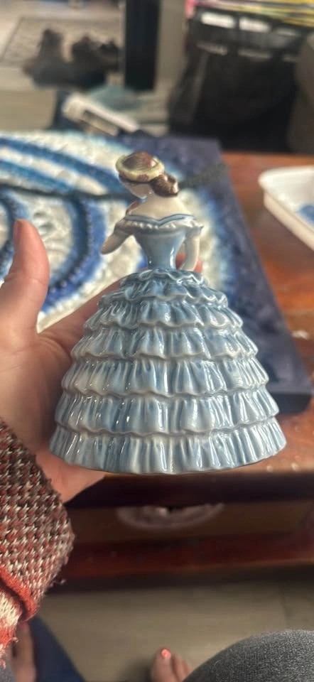 Design: It is a glazed ceramic/porcelain figure of a woman in a ruffled blue gown, part of the "Southern Belle" design.