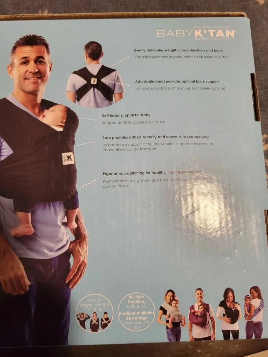 Selling a gently used Baby K'tan baby carrier in size small. It's black and comes with the original box and sash/storage bag. This carrier evenly distributes weight across your shoulders and back, and has an adjustable band for optimal back support. It also provides soft head support for baby and allows for multiple carrying positions! The carrier is machine washable for easy cleaning