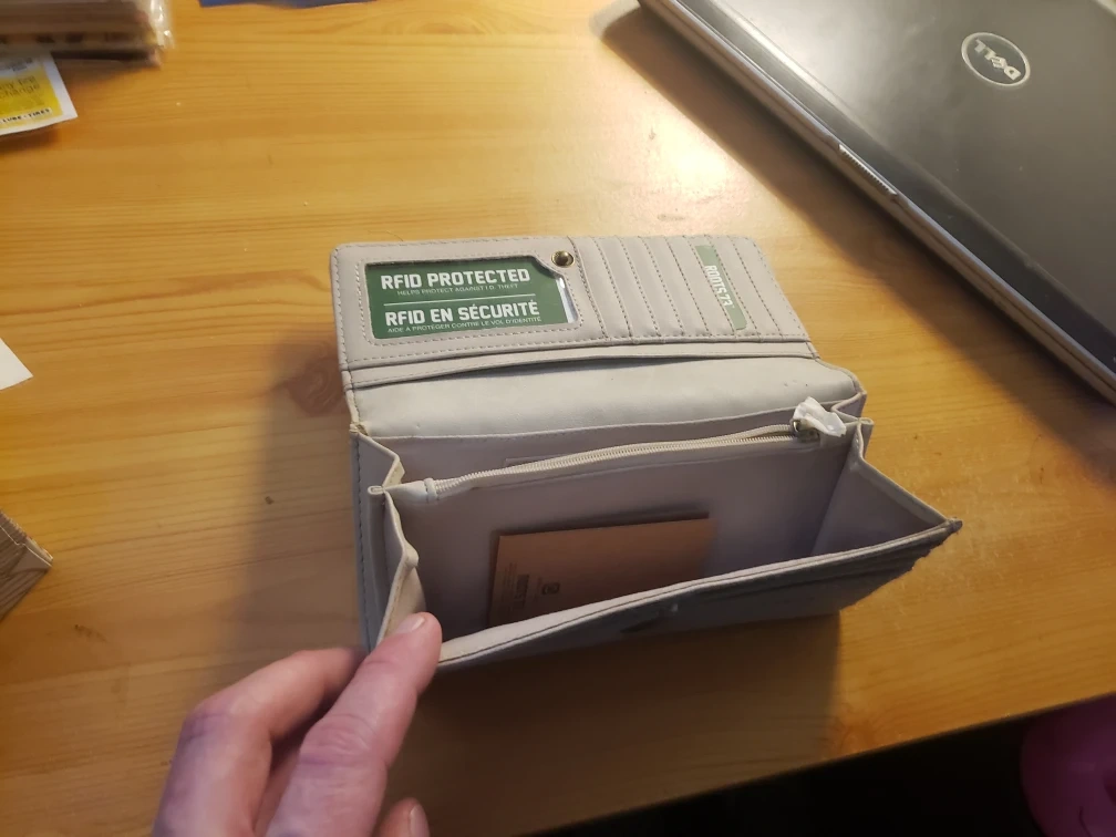 Selling a Roots73 wallet. It is RFID protected. The wallet is light grey and has a woven design on the outside. It has a zipper compartment and several card slots inside.
