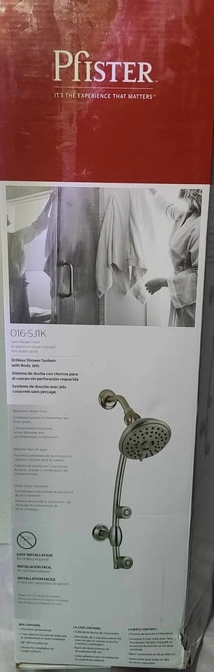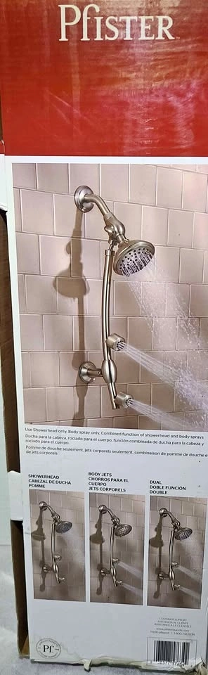 Pfister satin Nickle finish. Drilless shower system with body jets. Maximum water flow. 3 shower head functions spray, massage and spray/massage combination. Easy installation. Cash only, please.