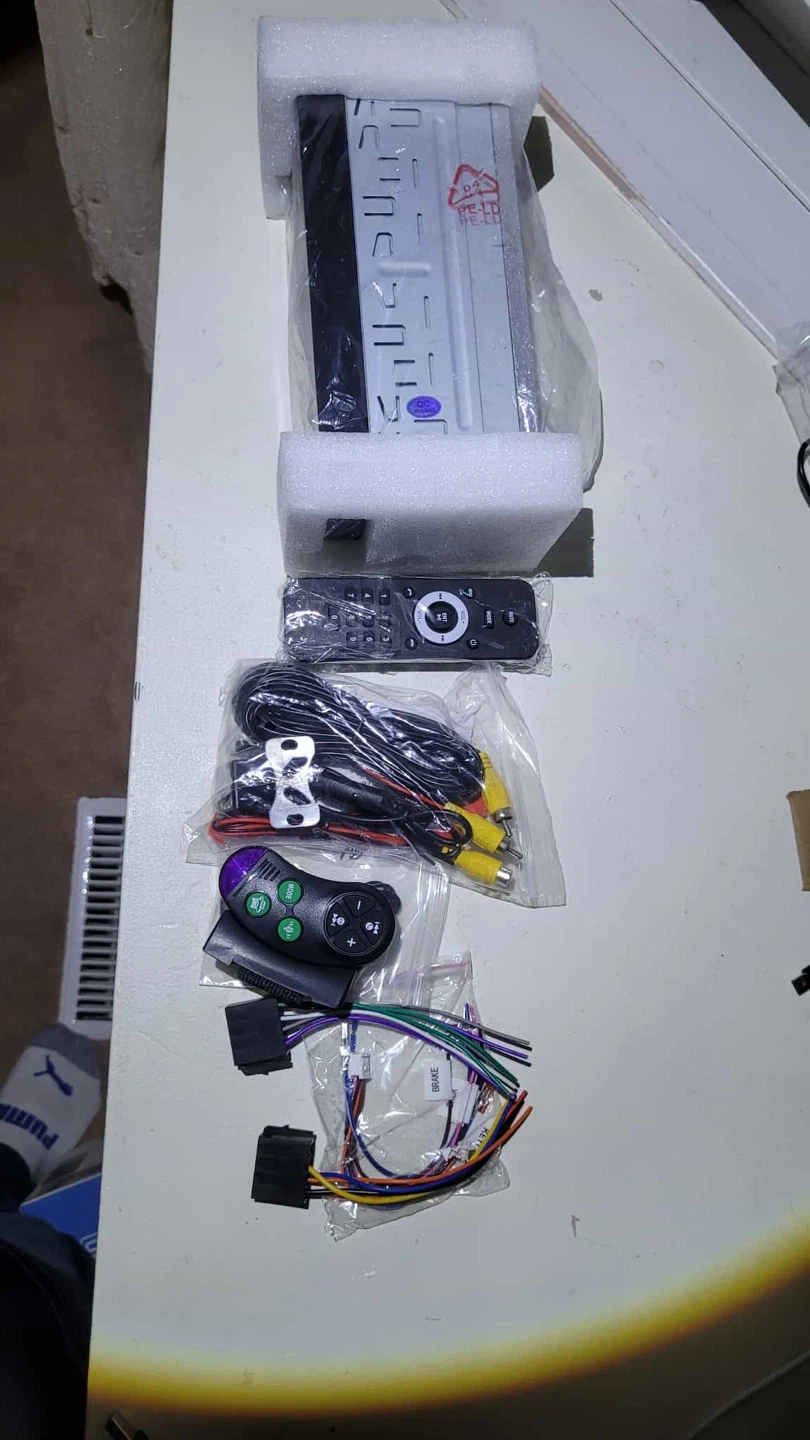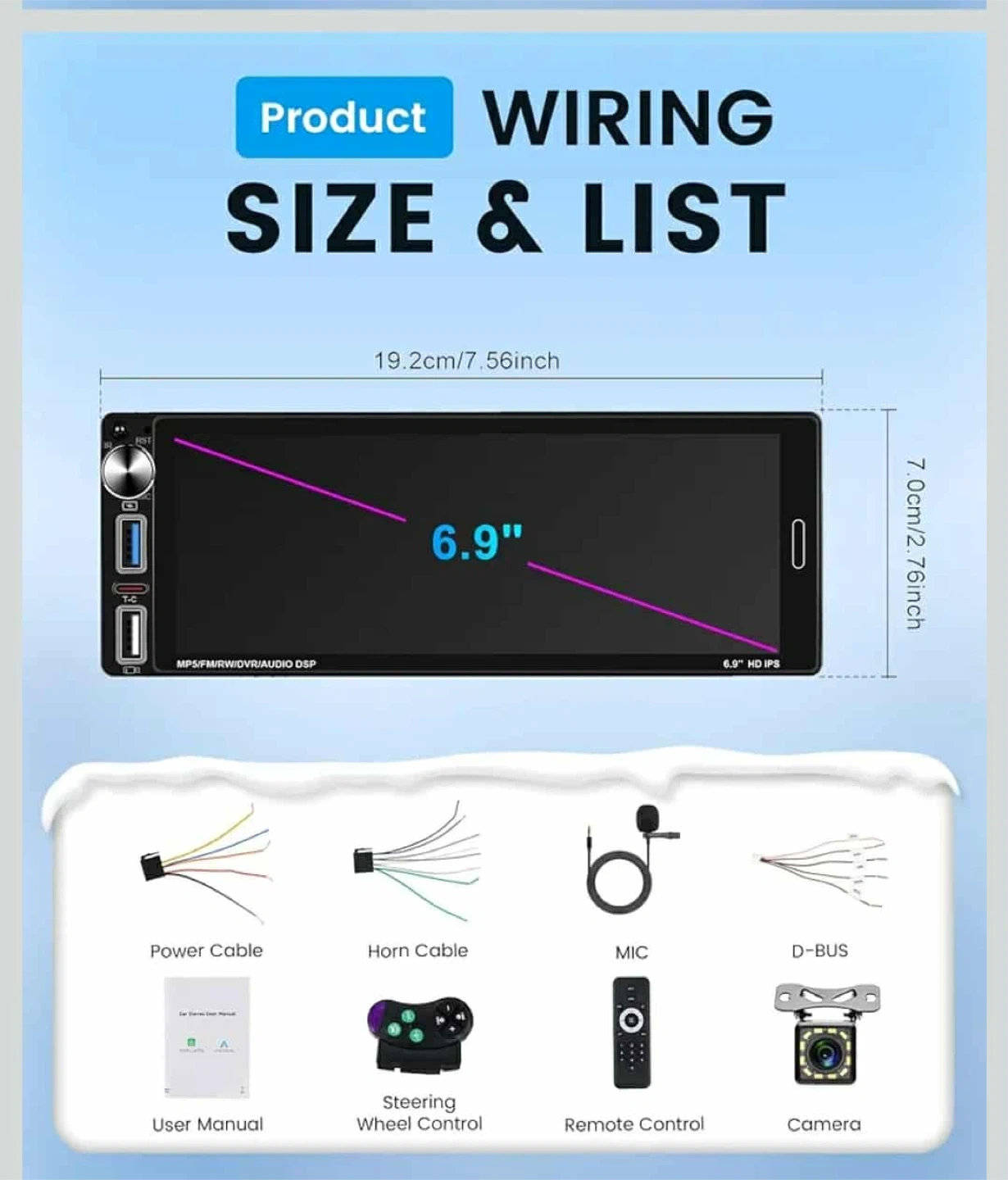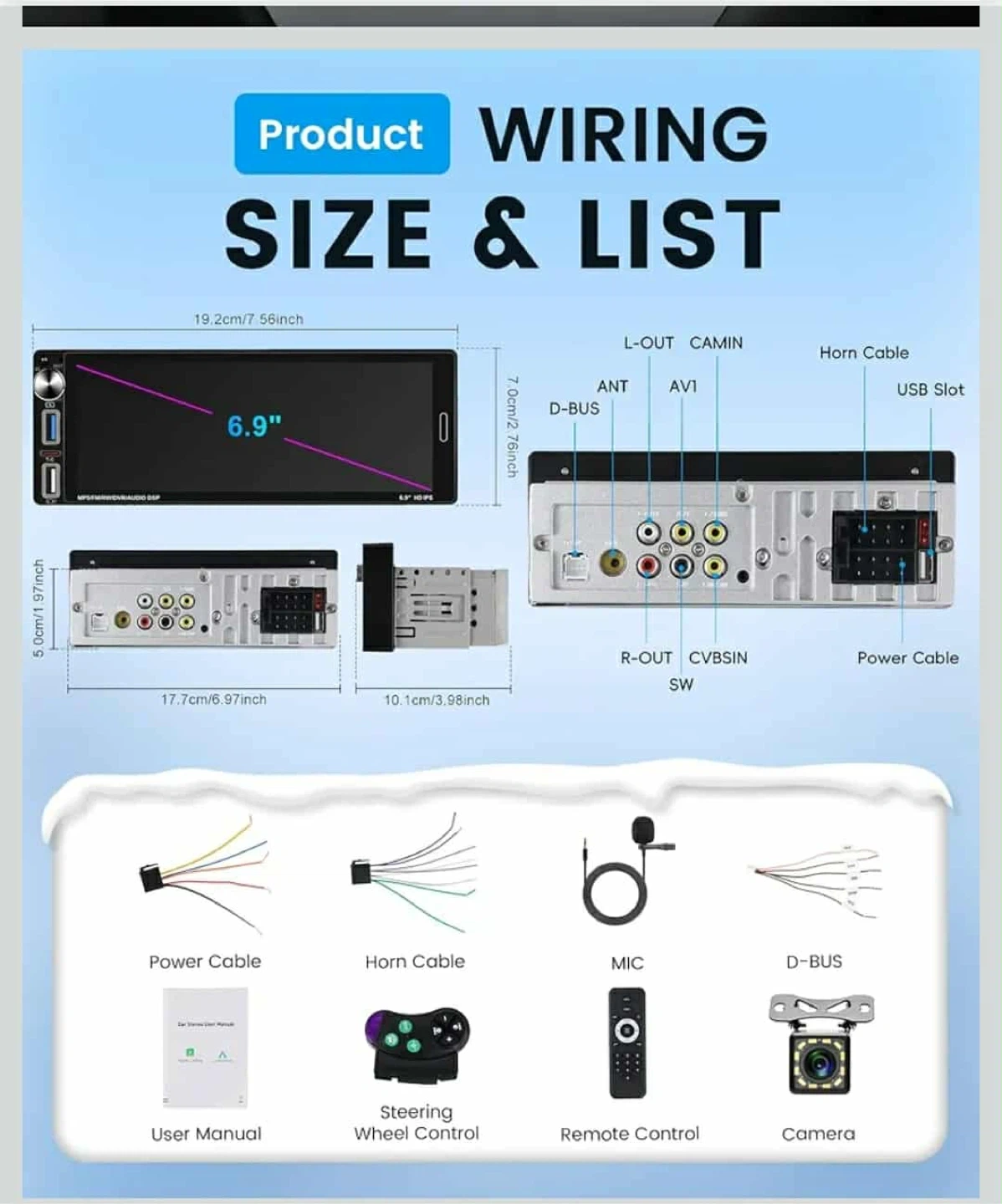 Selling a car stereo system with a high-definition reversing camera! It features Bluetooth connectivity, FM radio, EQ settings, and is compatible with Wireless/Wired CarPlay and Android Auto. The display is 6.9 inches. It comes with all the wiring and accessories shown in the pictures, including power cable, horn cable, MIC, D-BUS, steering wheel control, and remote control
