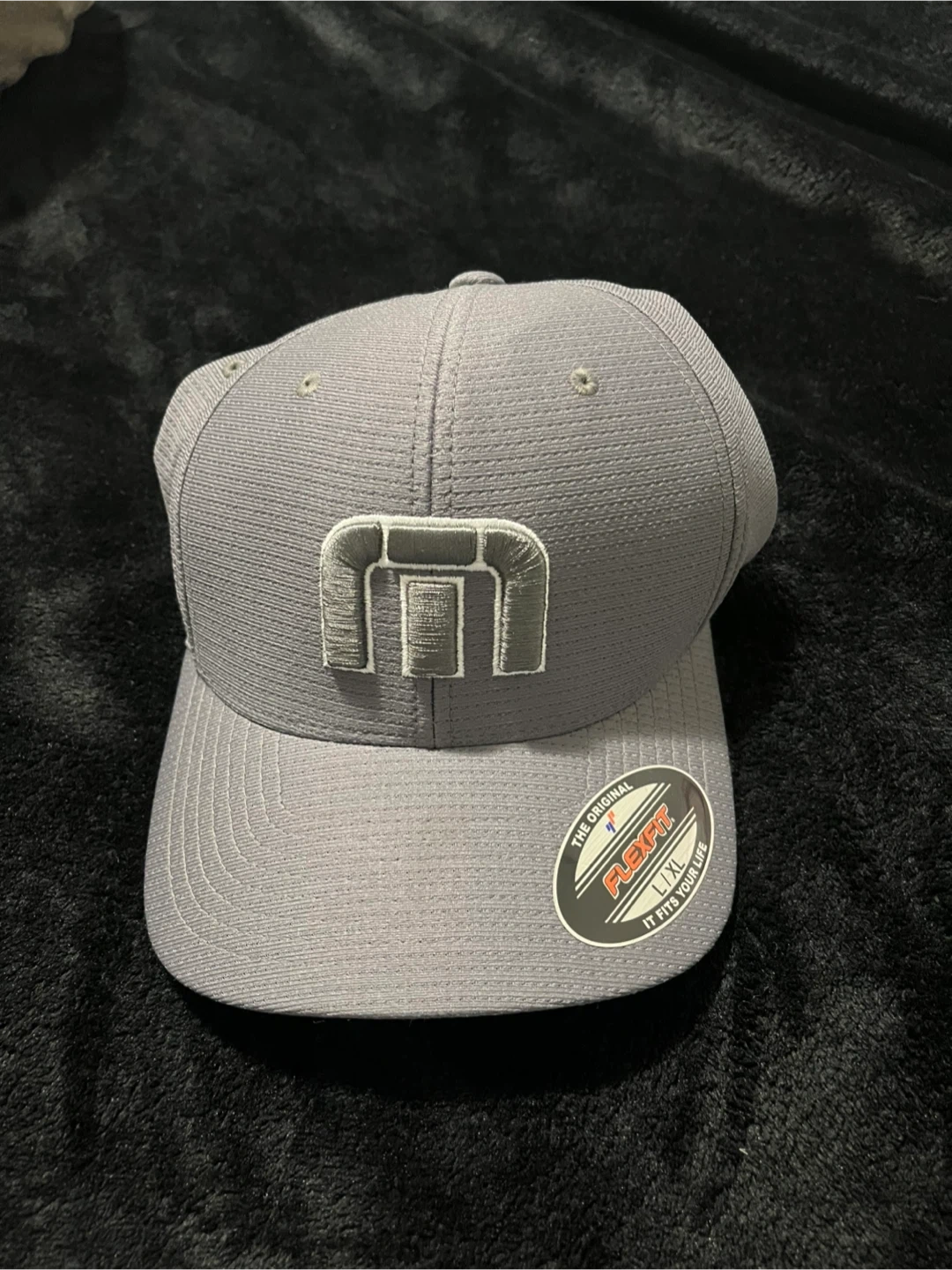 Here's a Travis Mathew Flexfit hat in size L/XL! It's a stylish grey colour and made of 100% polyester. It originally sold for $35.00.