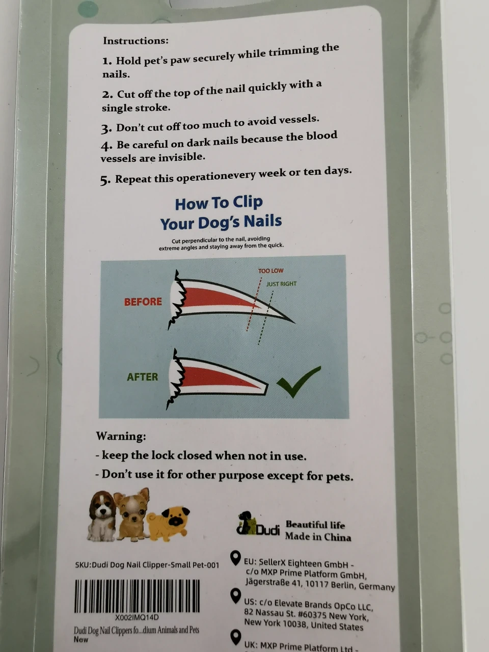Keep your furry friend's paws in tip-top shape with these brand new Dudi dog nail clippers, designed for small to medium breeds. These clippers feature a safety guard to prevent over-cutting and ensure precision trimming. Includes a nail file for smooth edges, all in the original packaging.