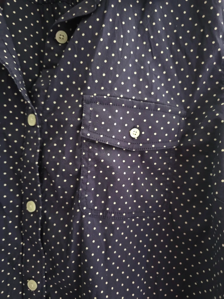 Here's a gently used L.L.Bean women's shirt in size XL. It features a classic polka dot pattern and is made of 96% cotton and 4% Lycra elastane. Perfect for a casual yet stylish look!