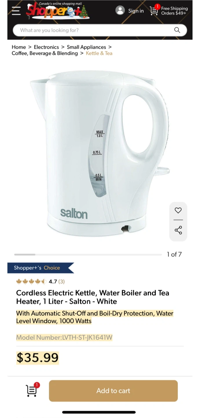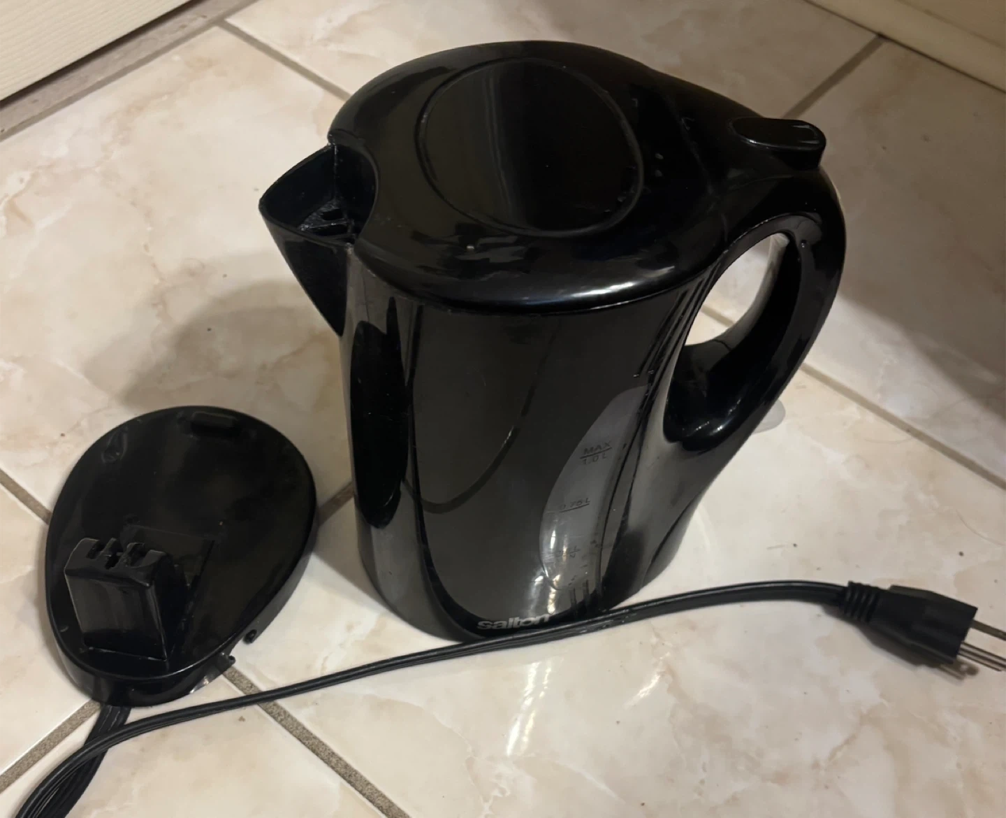 Selling a Salton electric kettle in black. It has a capacity of 1.0L. Works perfectly but shows some signs of use. Very convenient in winters for use in bathroom .. also in kitchen and bedroom. Gives instant hot water .. avoids waste of water and electricity.