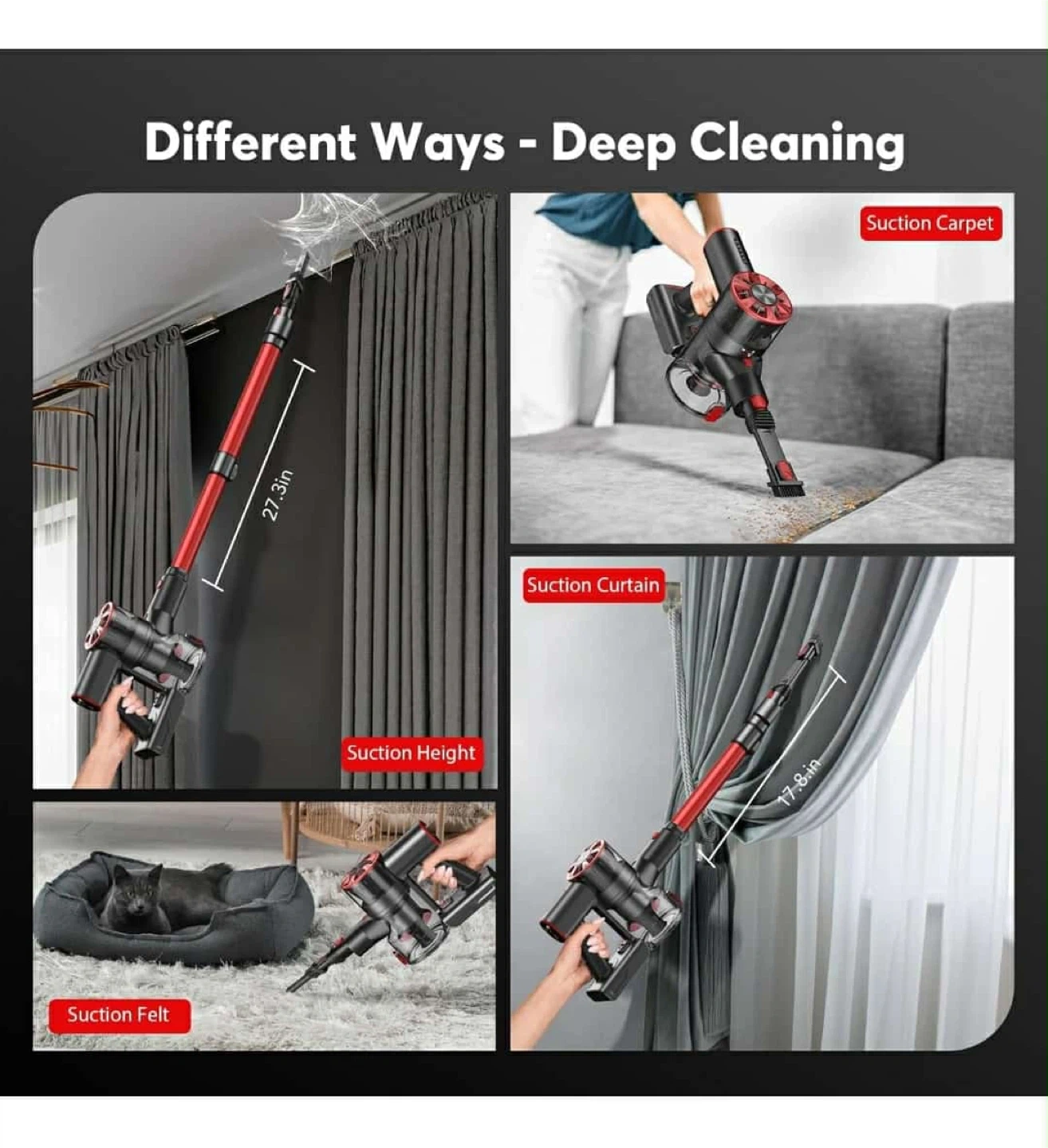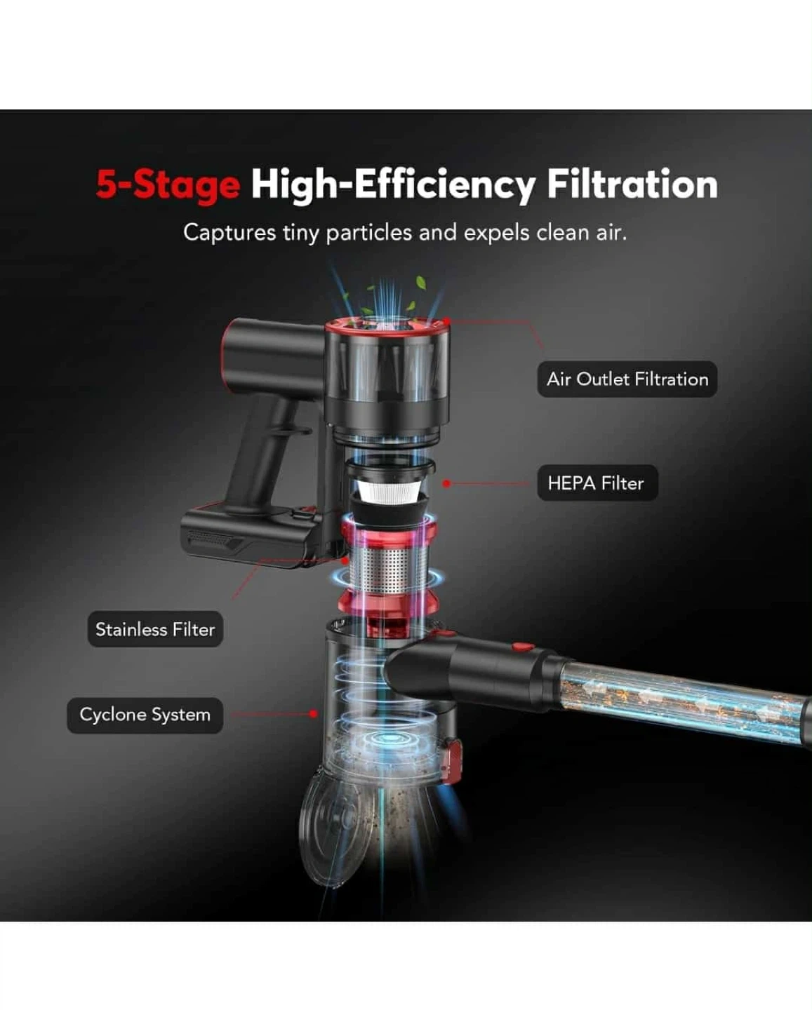 This cordless vacuum cleaner is great for deep cleaning. It has different suction levels to meet different cleaning needs and features 5-Stage High-Efficiency Filtration. It has an upgraded motor with super powerful suction!