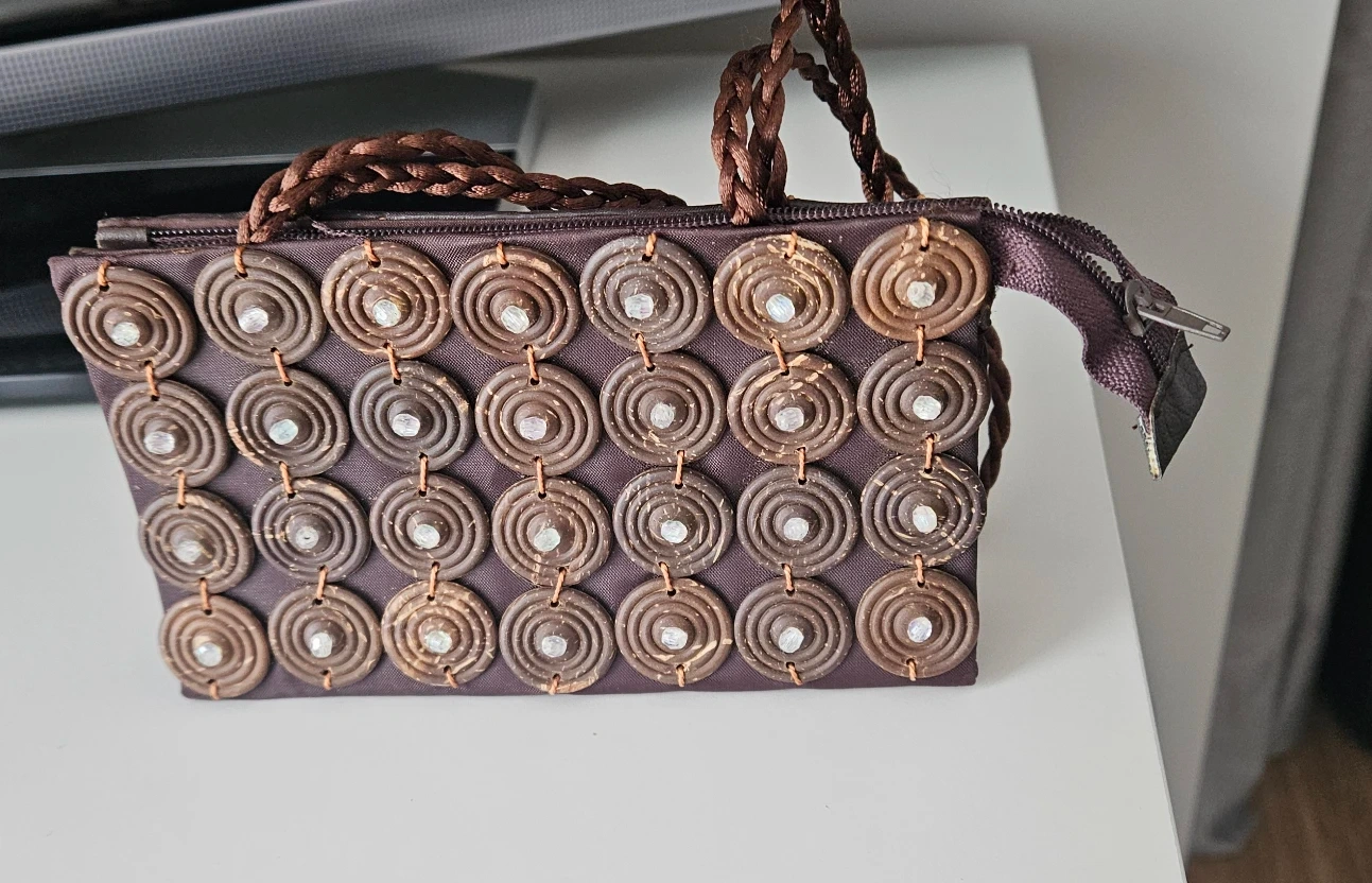 Here's a cute brown clutch with beaded detailing! It's perfect for carrying your essentials and adding a unique touch to your outfit