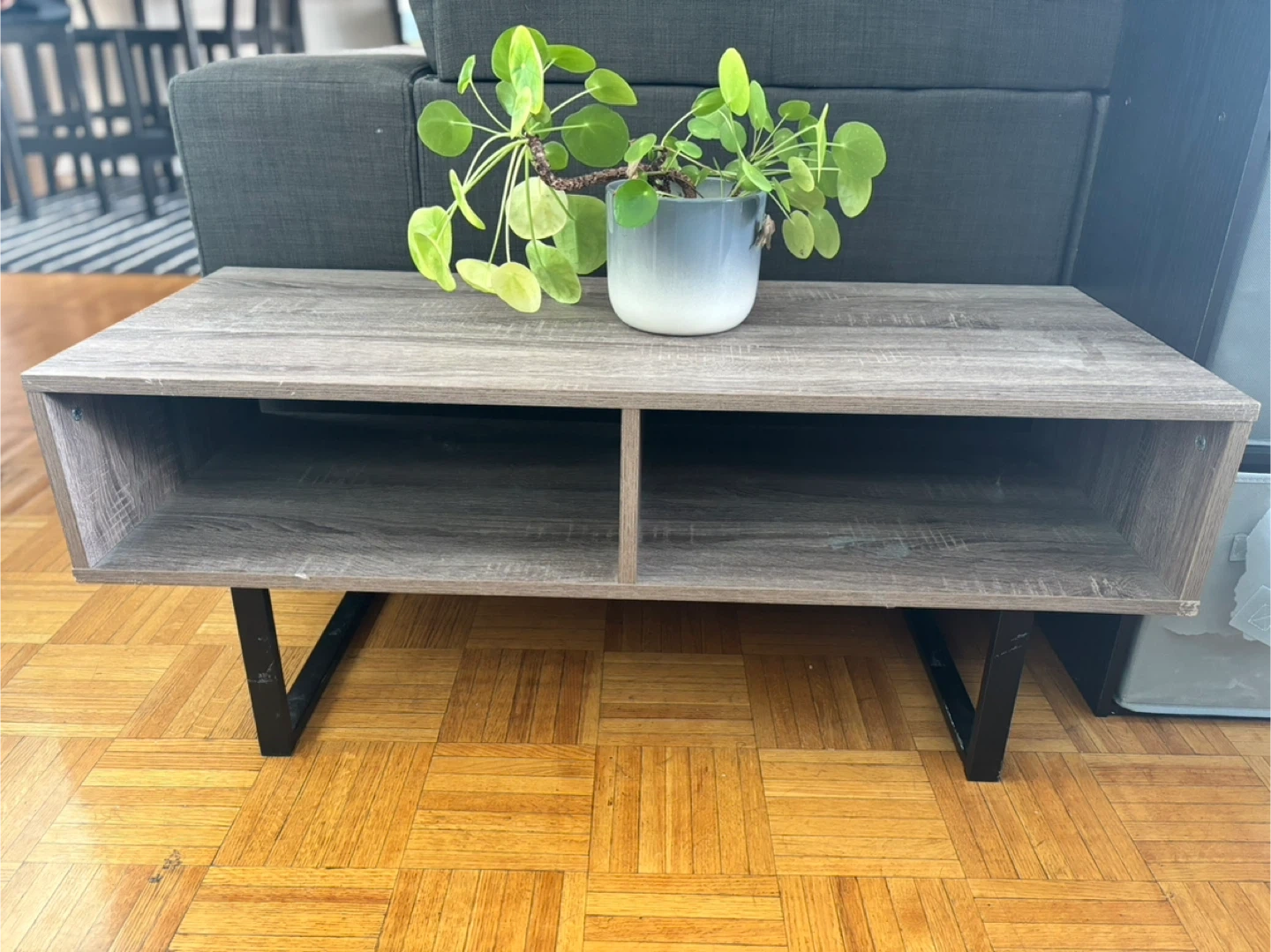 Selling a wood-look TV stand or bench with black metal legs. It has two cubbies for storage or display.