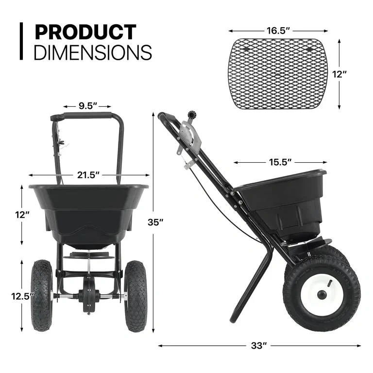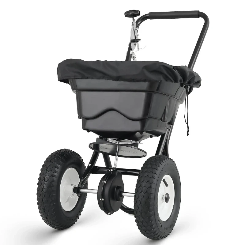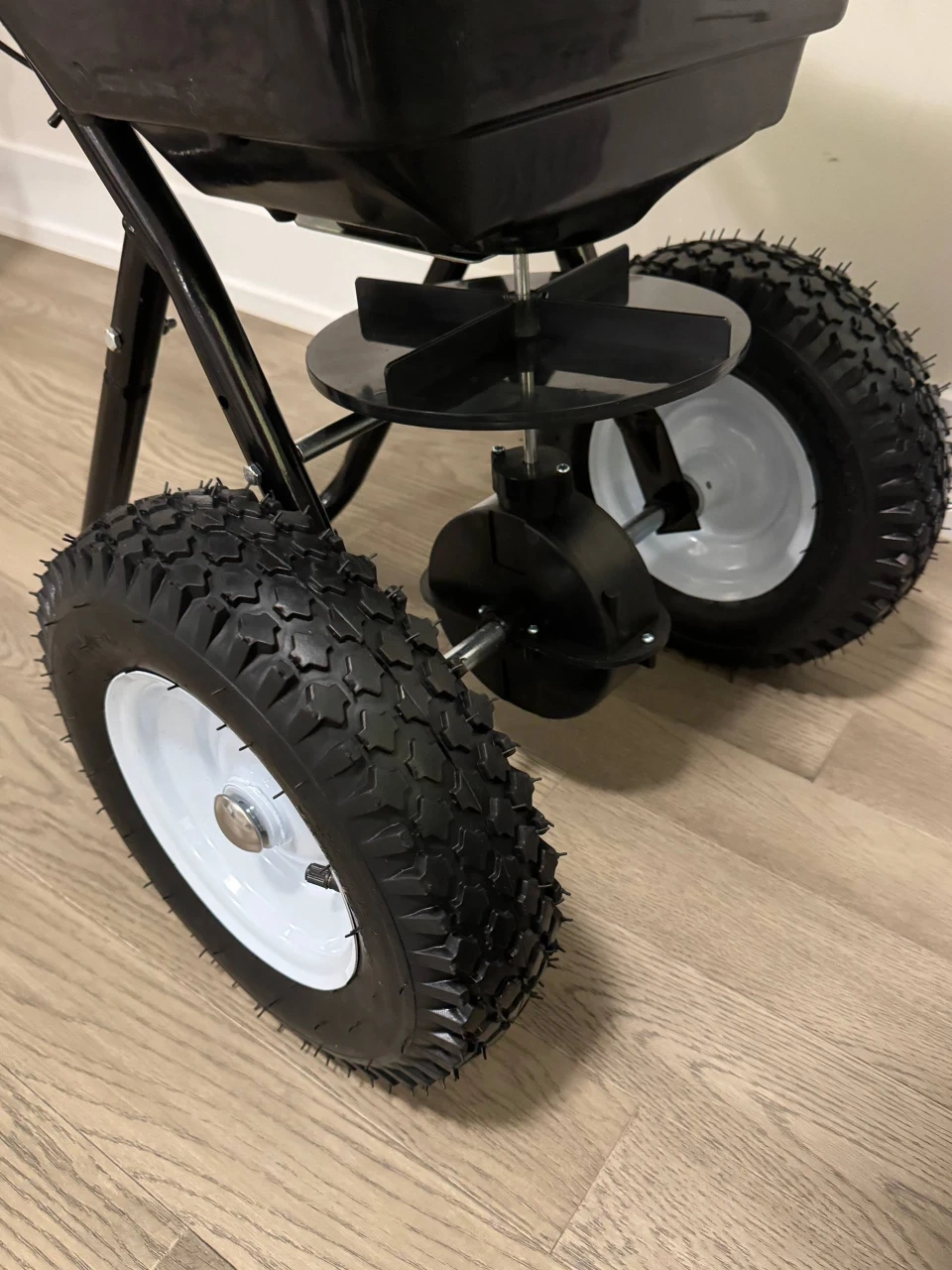 Brand new. Walk-behind broadcast spreader for grass seed, fertilizer, or ice melt. Large 80 lb capacity, sturdy build, smooth rolling wheels — perfect for lawns, driveways, and sidewalks.