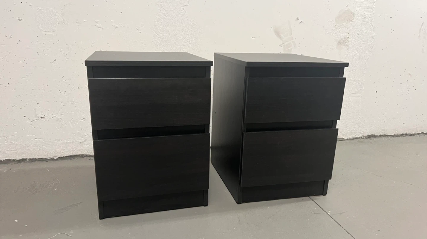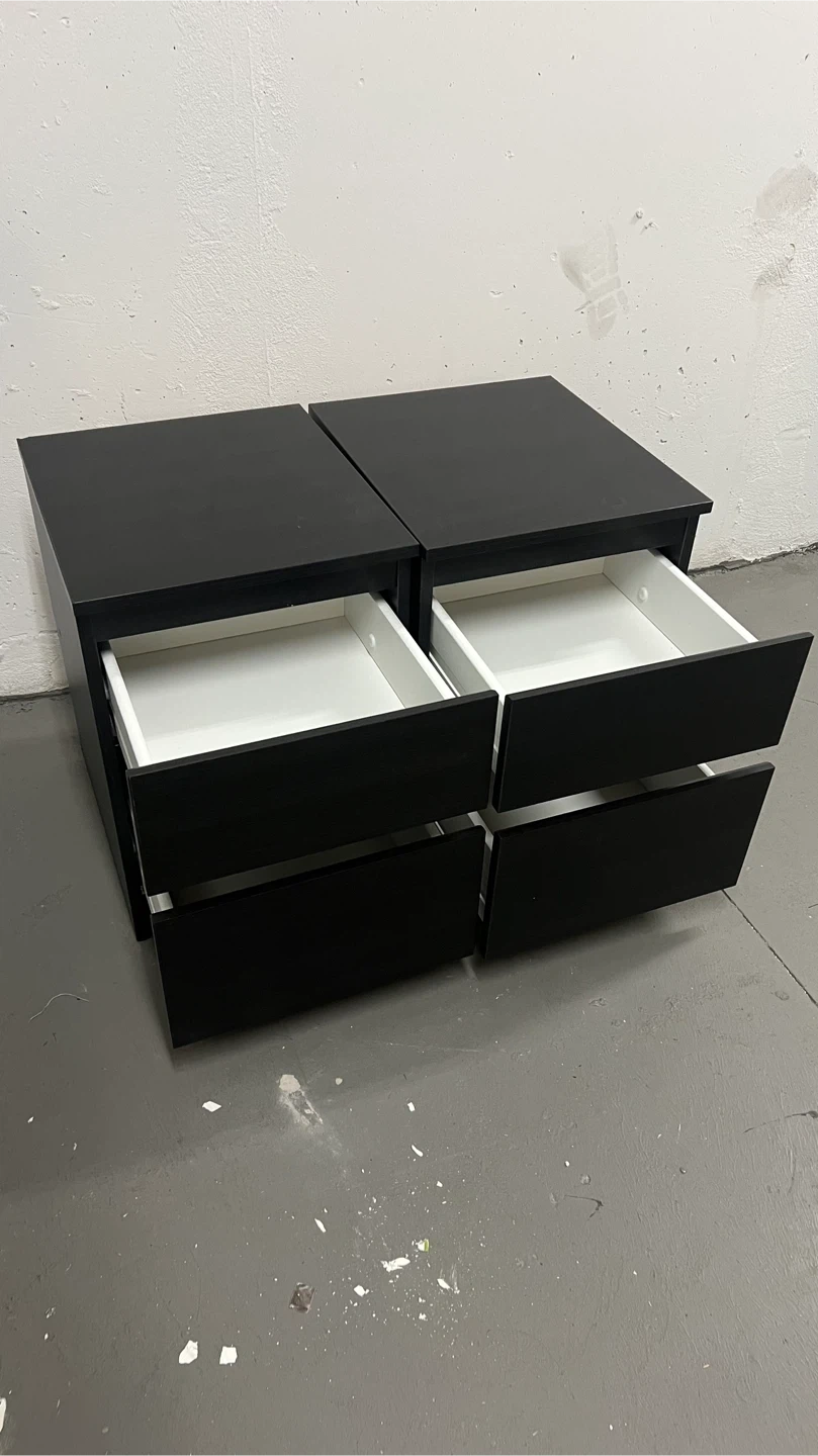 Selling a set of two IKEA Malm nightstands in black colour. They're in great shape and ready for a new home! These nightstands offer a clean look that fits just about anywhere. Perfect for adding some bedside storage!