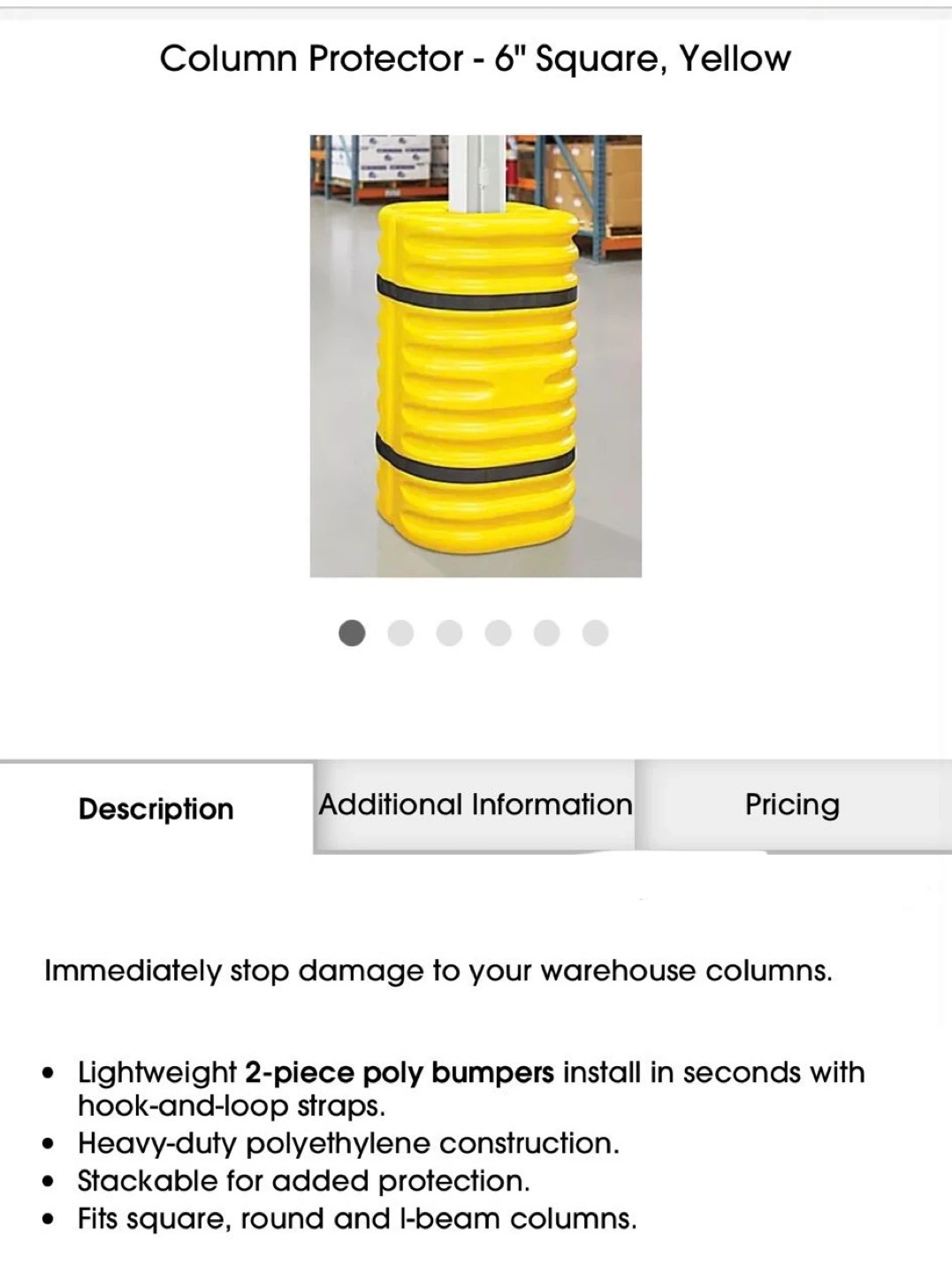 Keep your warehouse columns safe with this yellow column protector! It fits 6" square columns. Dimensions are 26 x 42 inches. Lightweight and easy to install with hook-and-loop straps, it's made of heavy-duty polyethylene and stackable for added protection. These are brand new with some minor scratches on the bottom.