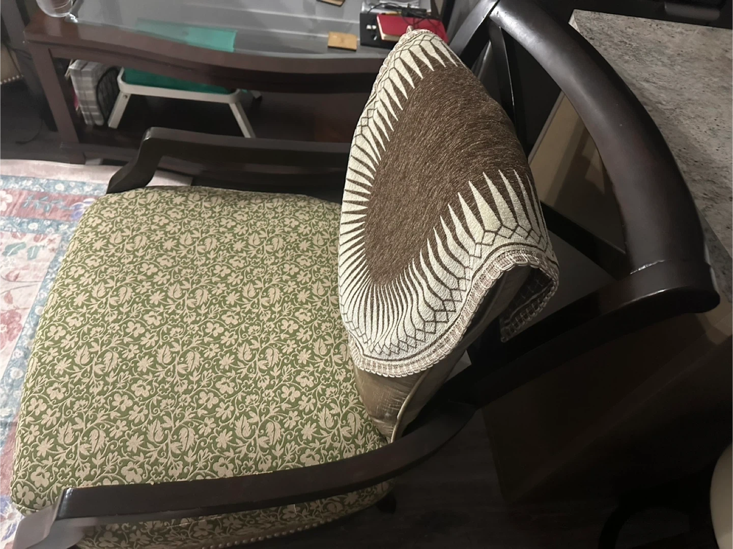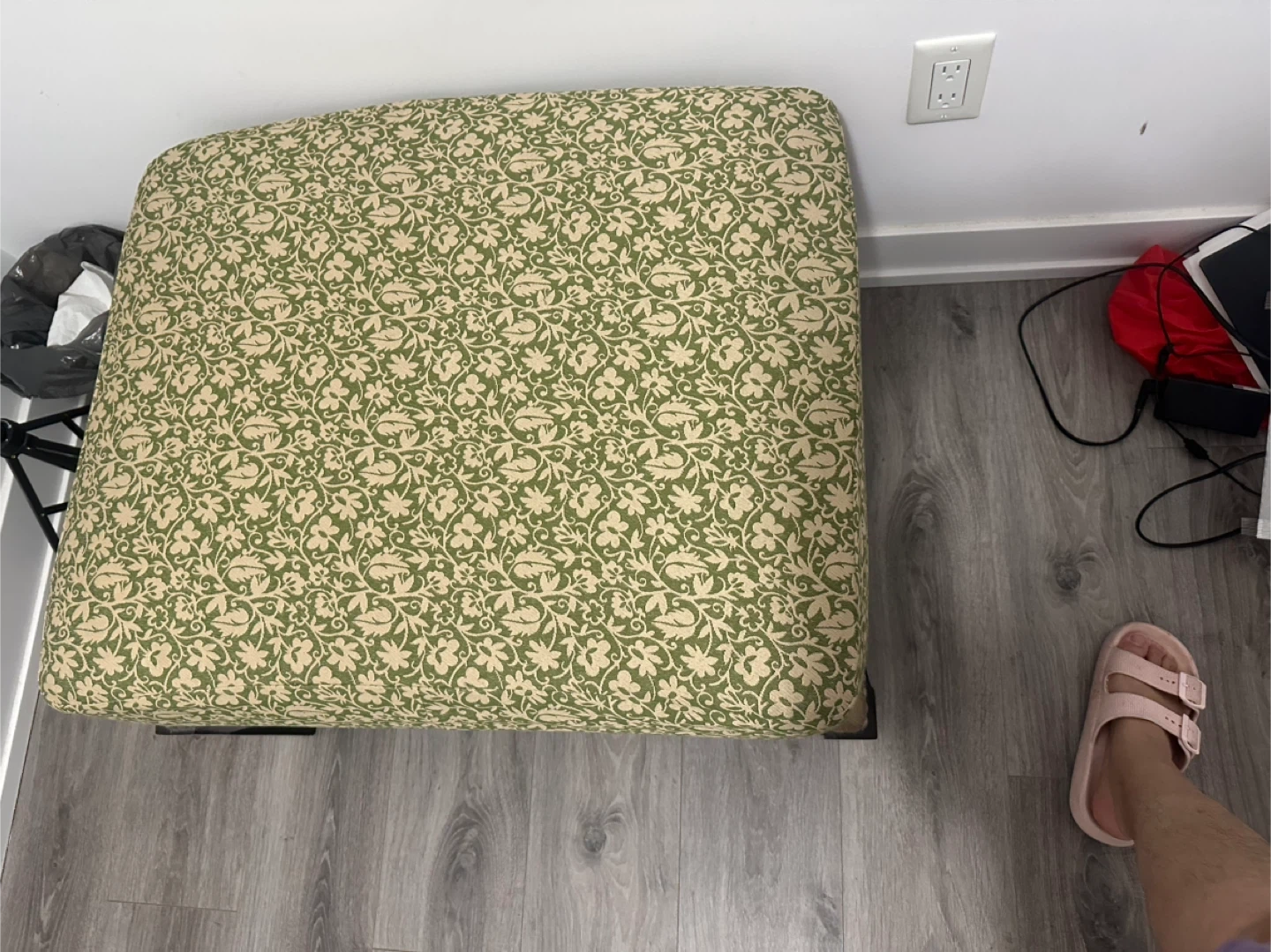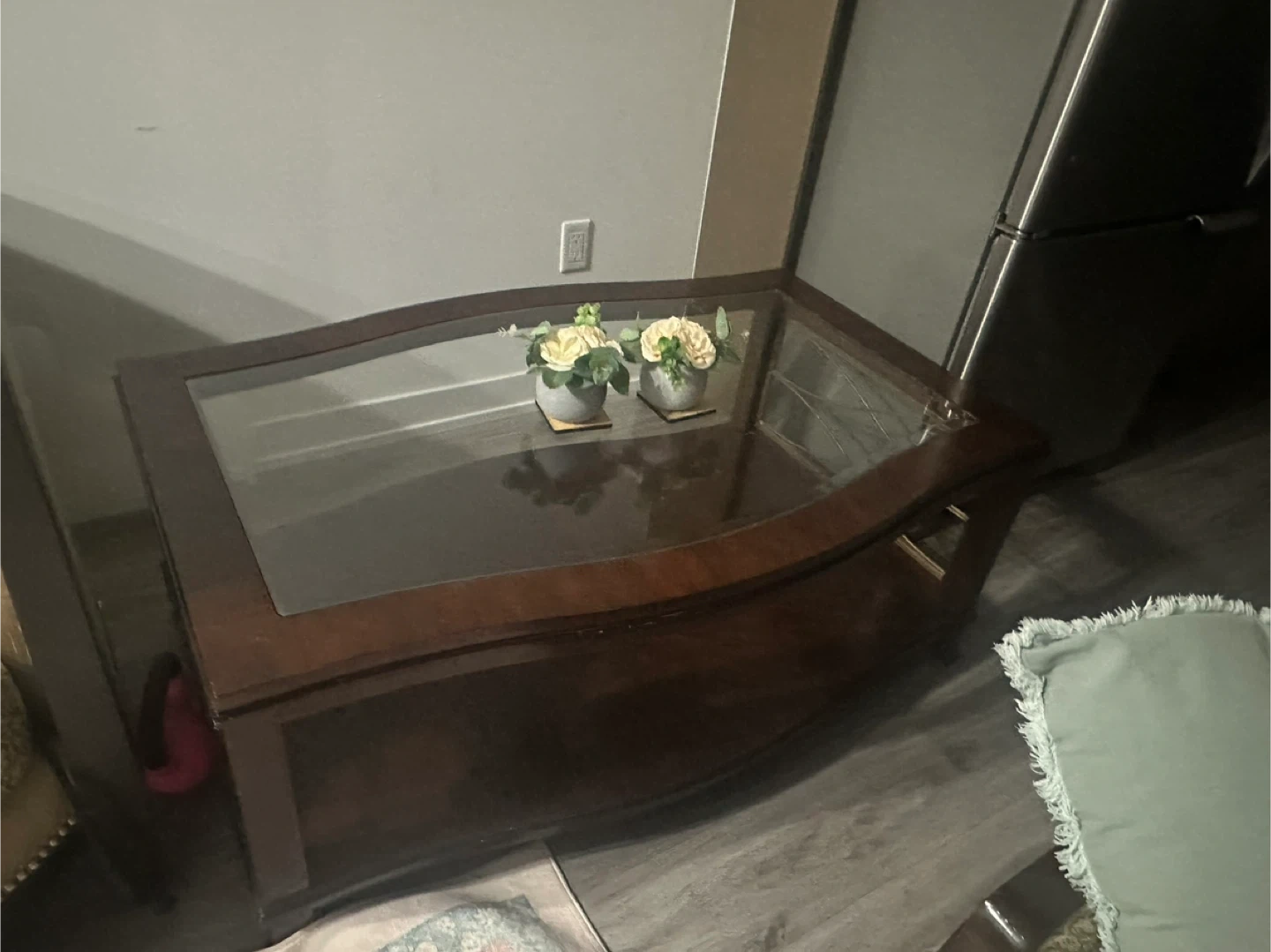 Selling a complete living room furniture set. Includes a sofa, chair, ottoman, and coffee table. All pieces are in good condition and feature a matching floral pattern fabric. The coffee table has a glass top and wood frame. Perfect for furnishing a living room or den!