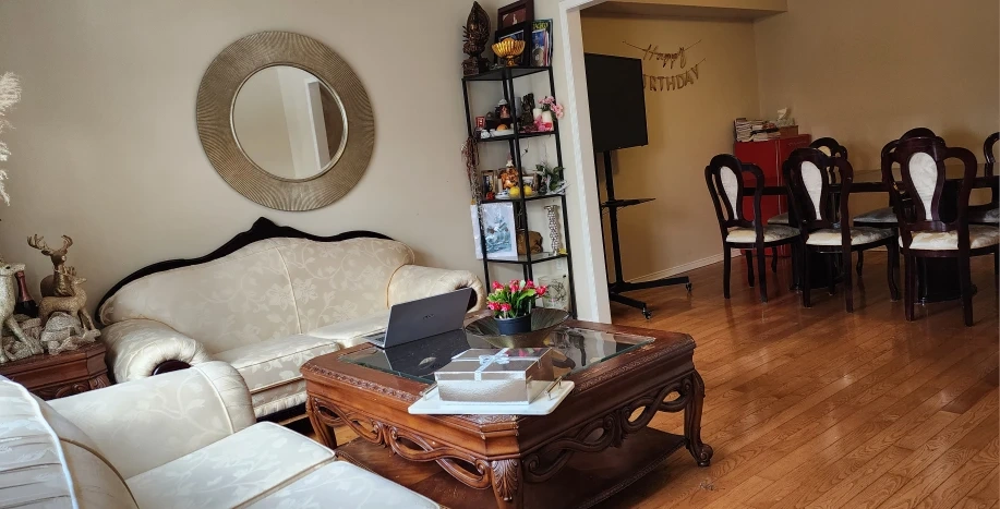 Selling a beautiful antique-style living room set! It includes a sofa, a loveseat, an armchair, a coffee table, all solid wood, for $650. * 2 matching sides table optional at $100 with sofa set purchase.