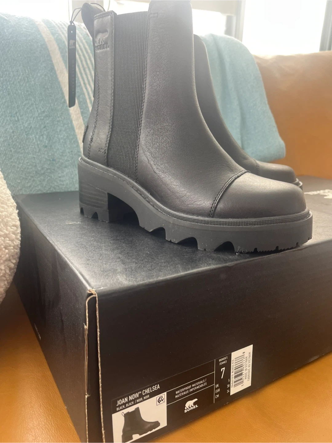 Selling a pair of Sorel Chelsea boots in black! They're new with tags and are a women's size 7. These boots are waterproof, making them perfect for all kinds of weather. Retail price $220. Comes with the original box