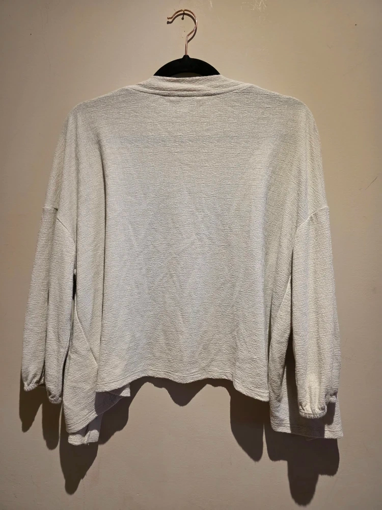 Selling a beige cardigan in size medium. It's in great condition and perfect for layering! The material has a nice texture to it. It's a stylish and versatile piece for any wardrobe