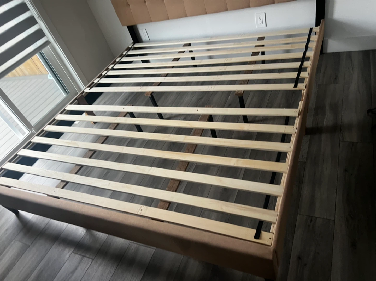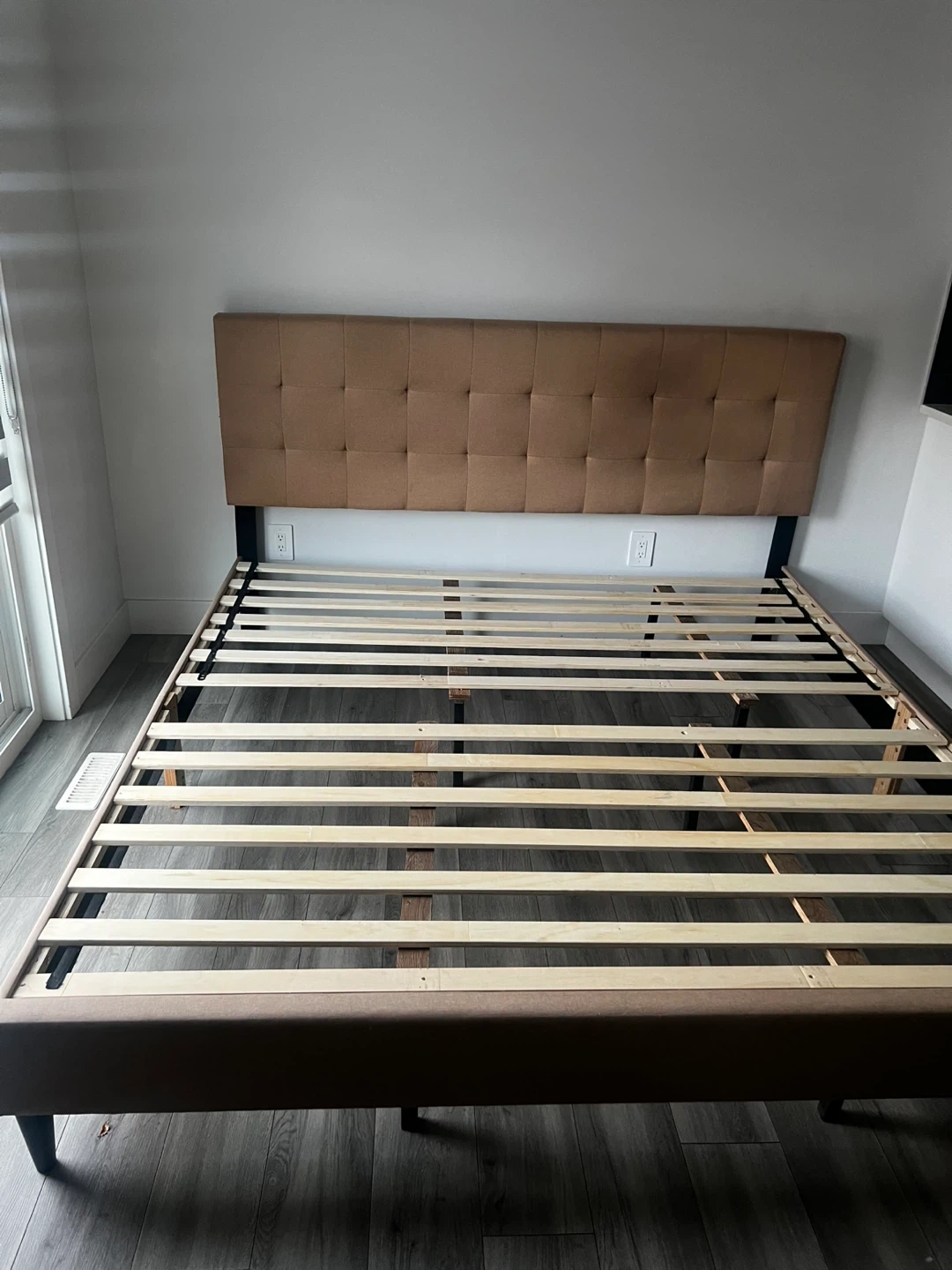 King Size Neutral Color Upholstered Platform Bed Frame. It's In Good Shape (One Of The Legs On The Headboard Is A Bit Loose But Still Very Strong & Usable).