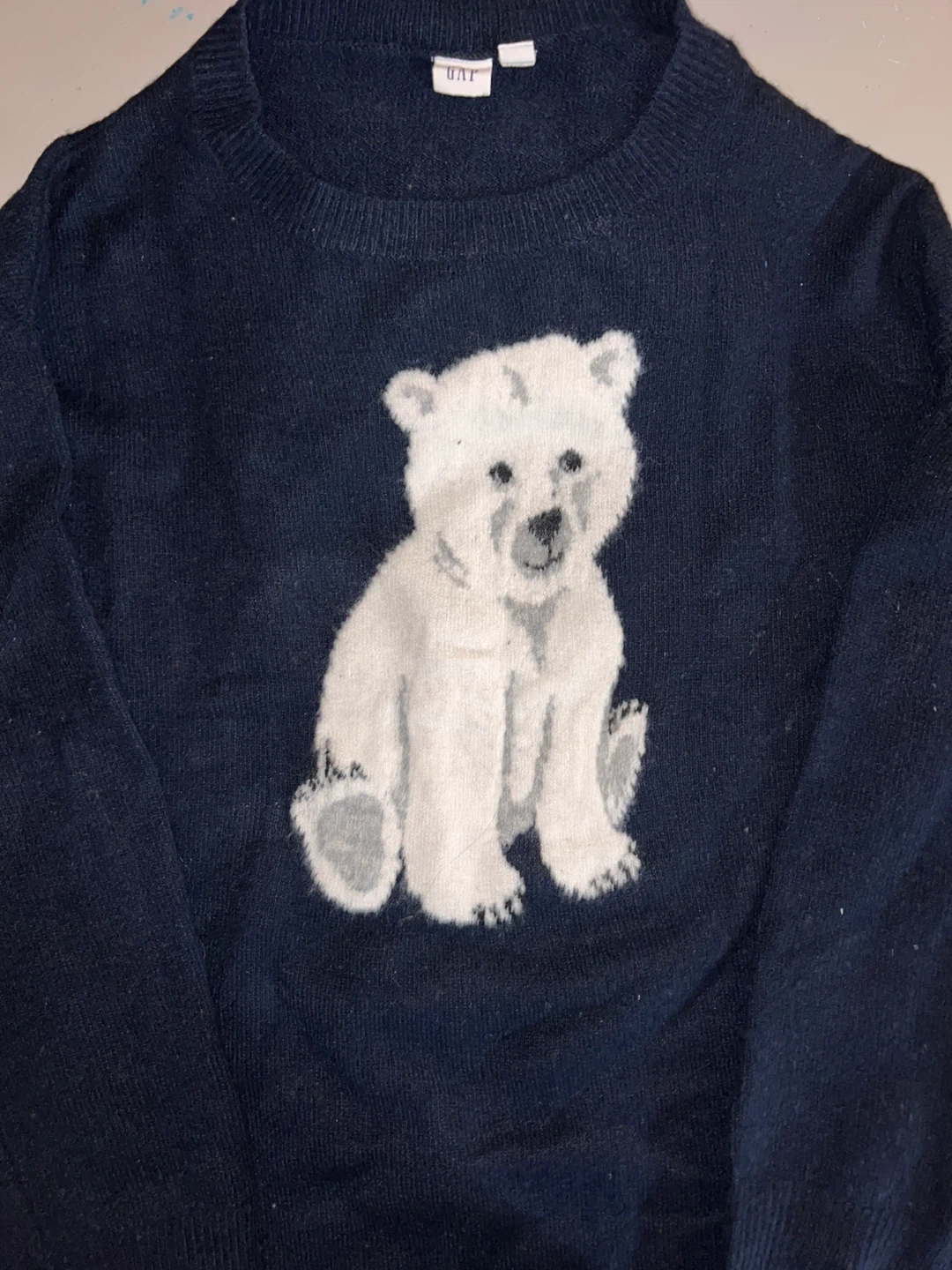 Here's a cozy GAP sweater featuring an adorable polar bear design! It's in great condition and perfect for keeping you warm during the colder months. The sweater is a dark blue colour.