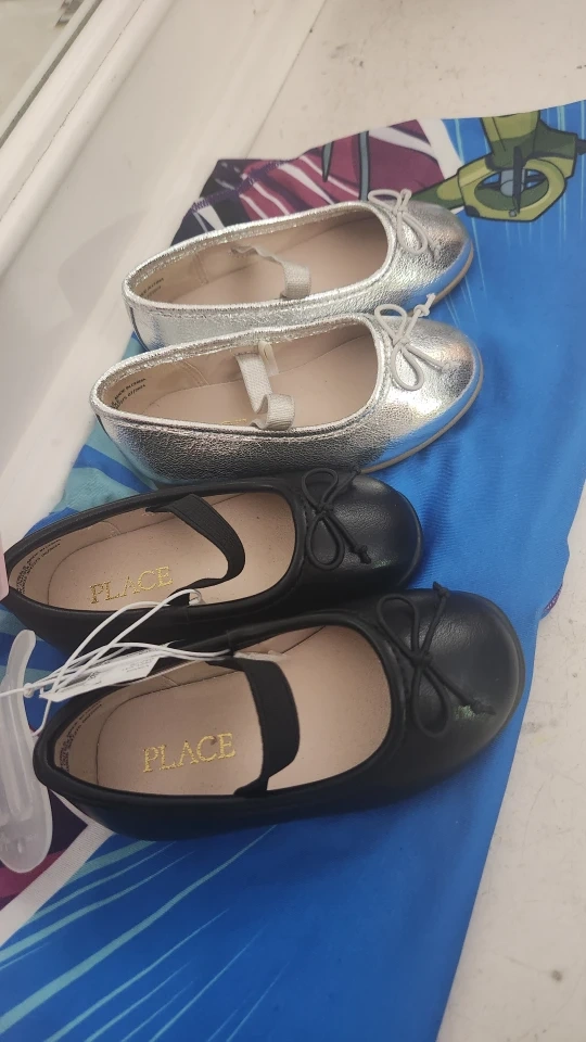 Selling a pair of Children's Place ballet flats in size 5. One pair is black and the other is silver. They are brand new never worn. $18 each or both for $25