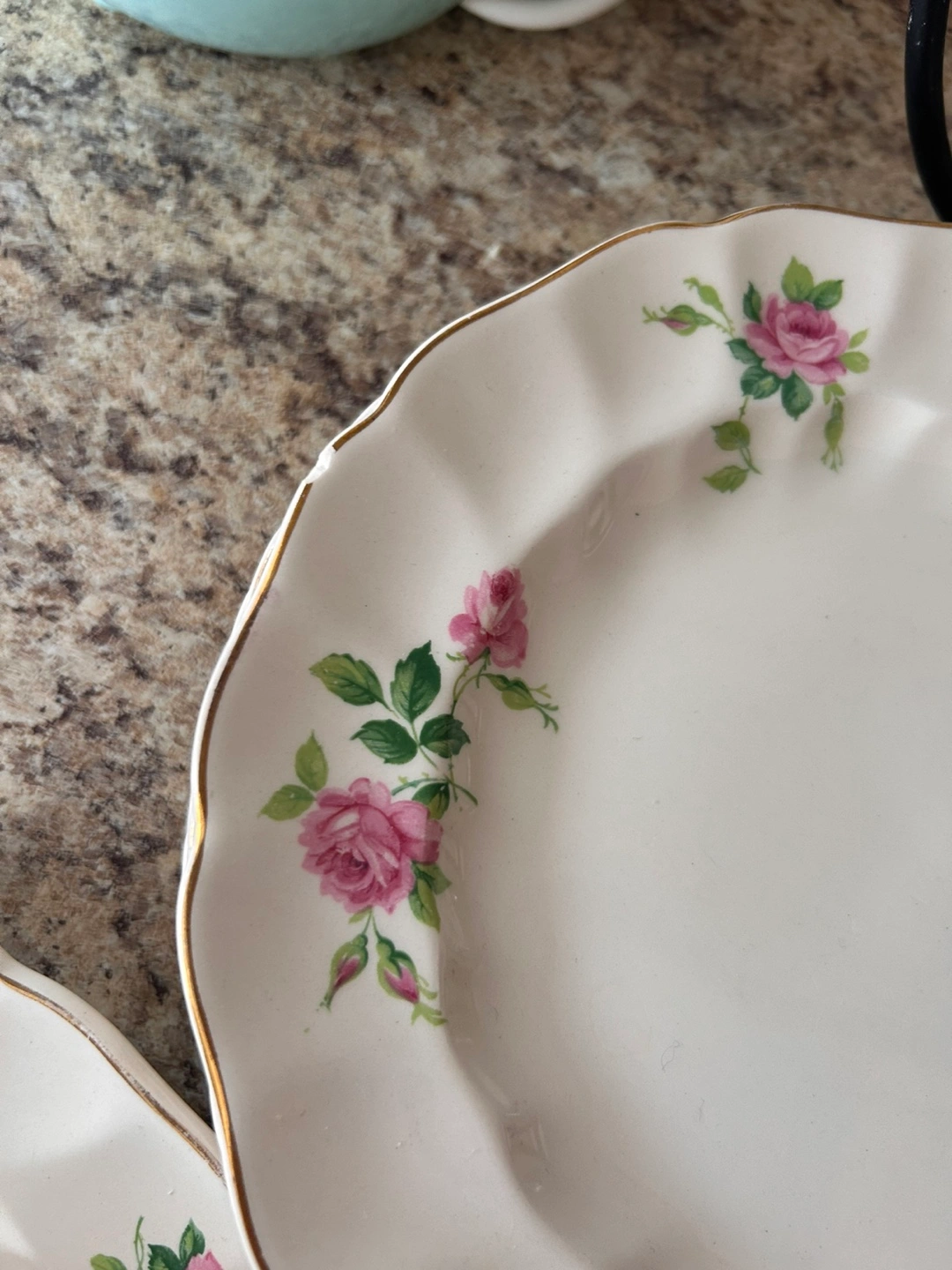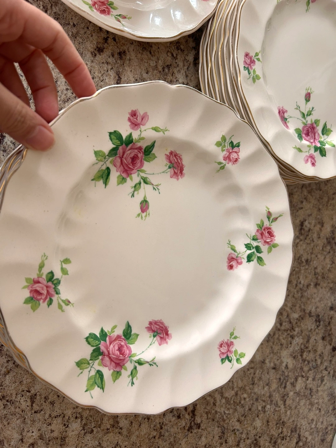 Selling a lovely vintage dinnerware set featuring a delicate floral design. The set includes plates and bowls, perfect for adding a touch of elegance to your dining table. They're in good vintage condition. Slight crazing on few plates and also there is small on one plate. See the pics