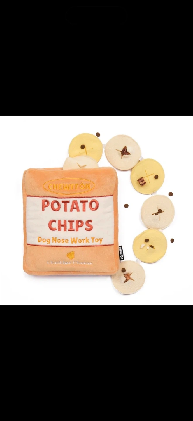 This Chewiton Potato Chips Dog Nose Work Toy is an interactive snuffle toy! It's designed to make it easier to hide treats in the potato chips bag. The adjustable snuffle level lets you customize with scissors for a perfect fit for your pup, downgrading the play level by expanding the existing incision