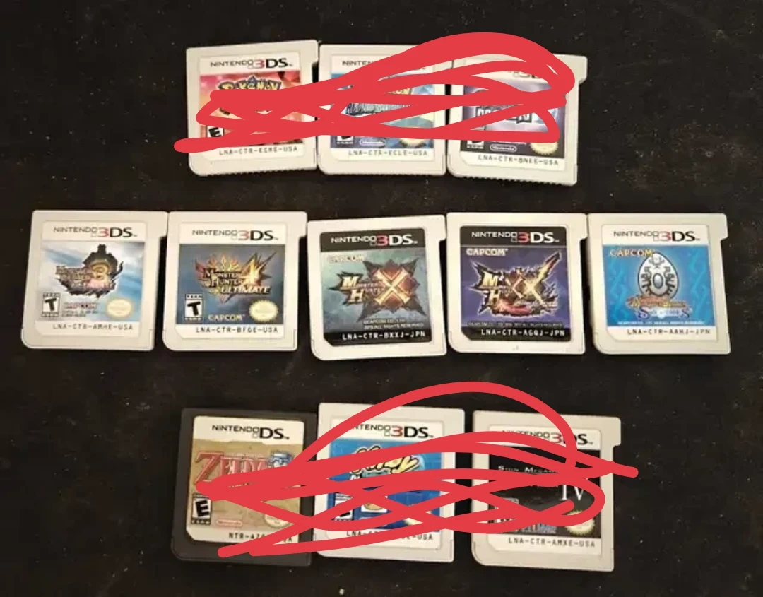 Selling a collection of Nintendo 3DS games! Cartridges only, all $25! Titles include: - Monster Hunter 3 Ultimate - Monster Hunter 4 Ultimate - Monster Hunter X(JPN) - Monster Hunter XX(JPN) - Monster Hunter Stories(JPN) If you are taking more, I could give you a discount.